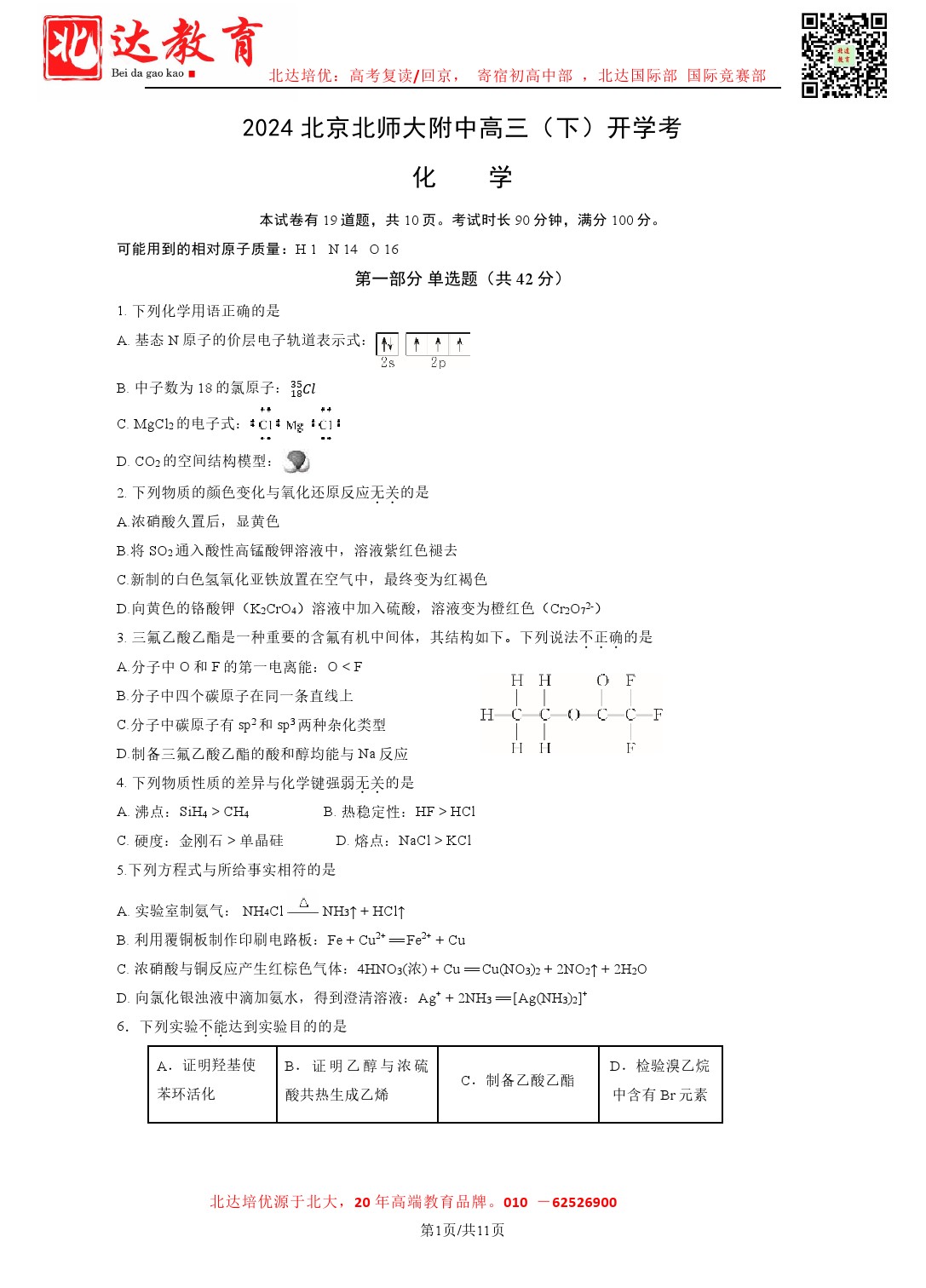 2024北京各中学高三开学考已结束,为了方便同学们查找相关试题,admw360高考网特意整理了2024年北师大附中高三下开学考化学试题及答案,需要的同学赶紧下载练习吧。