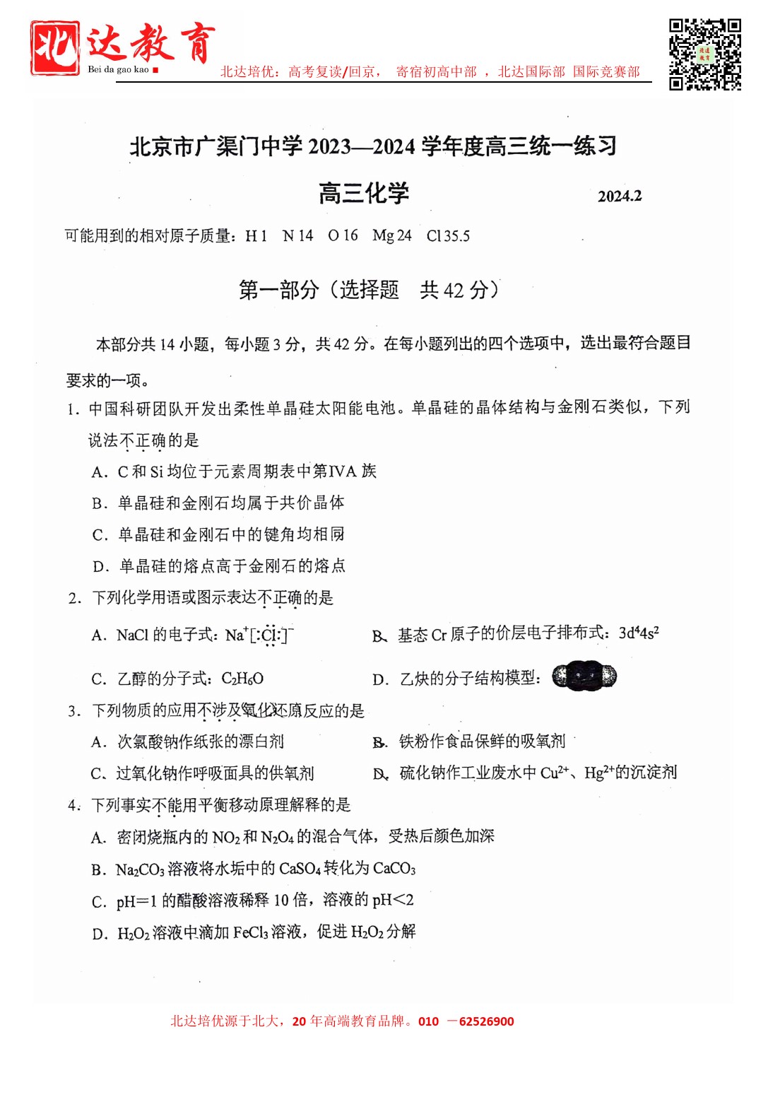 2024北京各中学高三开学考已结束,为了方便同学们查找相关试题,admw360高考网特意整理了2024北京广渠门中学高三下开学考化学试题及答案,需要的同学赶紧下载练习吧。