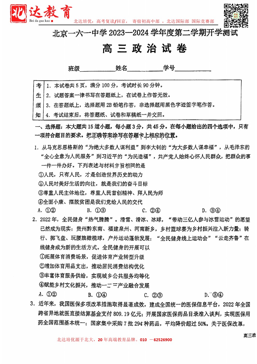 2024北京各中学高三开学考已结束,为了方便同学们查找相关试题,admw360高考网特意整理了2023-2024学年北京第一六一中学高三下开学考政治试题及答案,需要的同学赶紧下载练习吧。