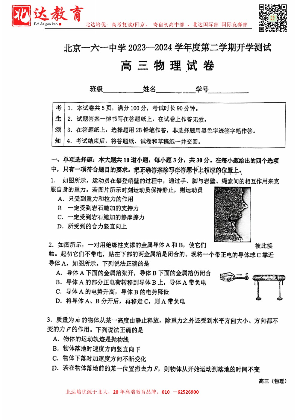 2024北京各中学高三开学考已结束,为了方便同学们查找相关试题,admw360高考网特意整理了2023-2024北京一六一中高三下开学考物理试题及答案,需要的同学赶紧下载练习吧。