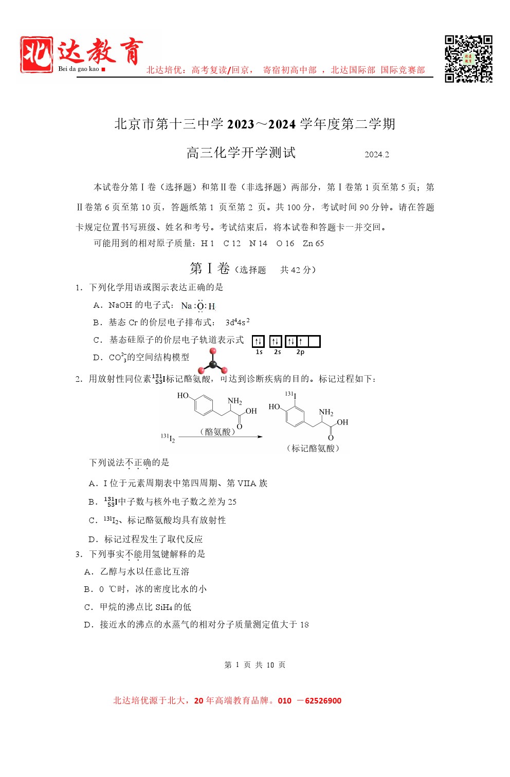 2024北京各中学高三开学考已结束,为了方便同学们查找相关试题,admw360高考网特意整理了2023-2024北京第十三中学高三下开学考化学试题及答案,需要的同学赶紧下载练习吧。