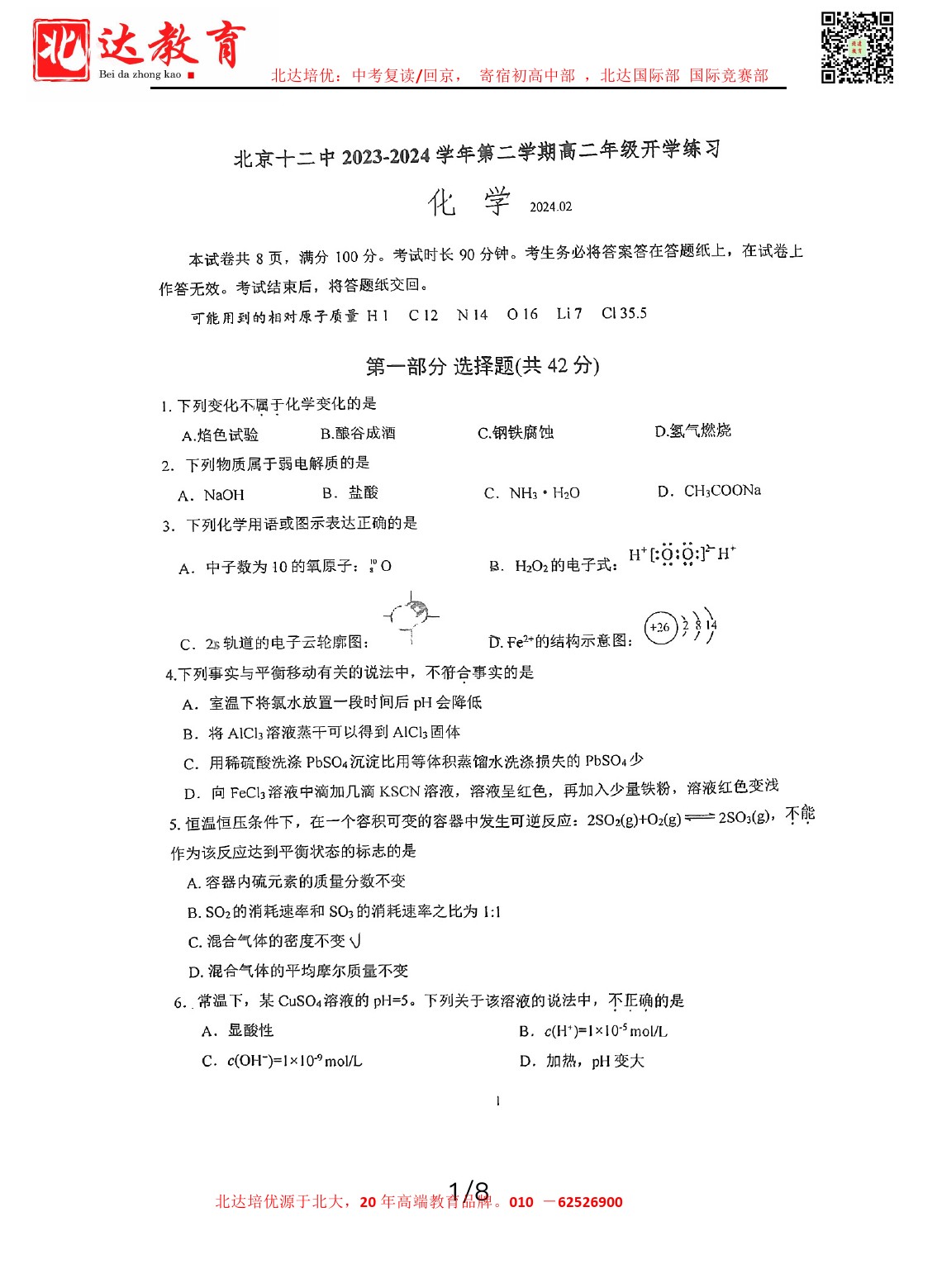2024北京各中学高二开学考已结束,为了方便同学们查找相关试题,admw360高考网特意整理了2023-2024学年北京十二中高二下开学考化学试题及答案,需要的同学赶紧下载练习吧。