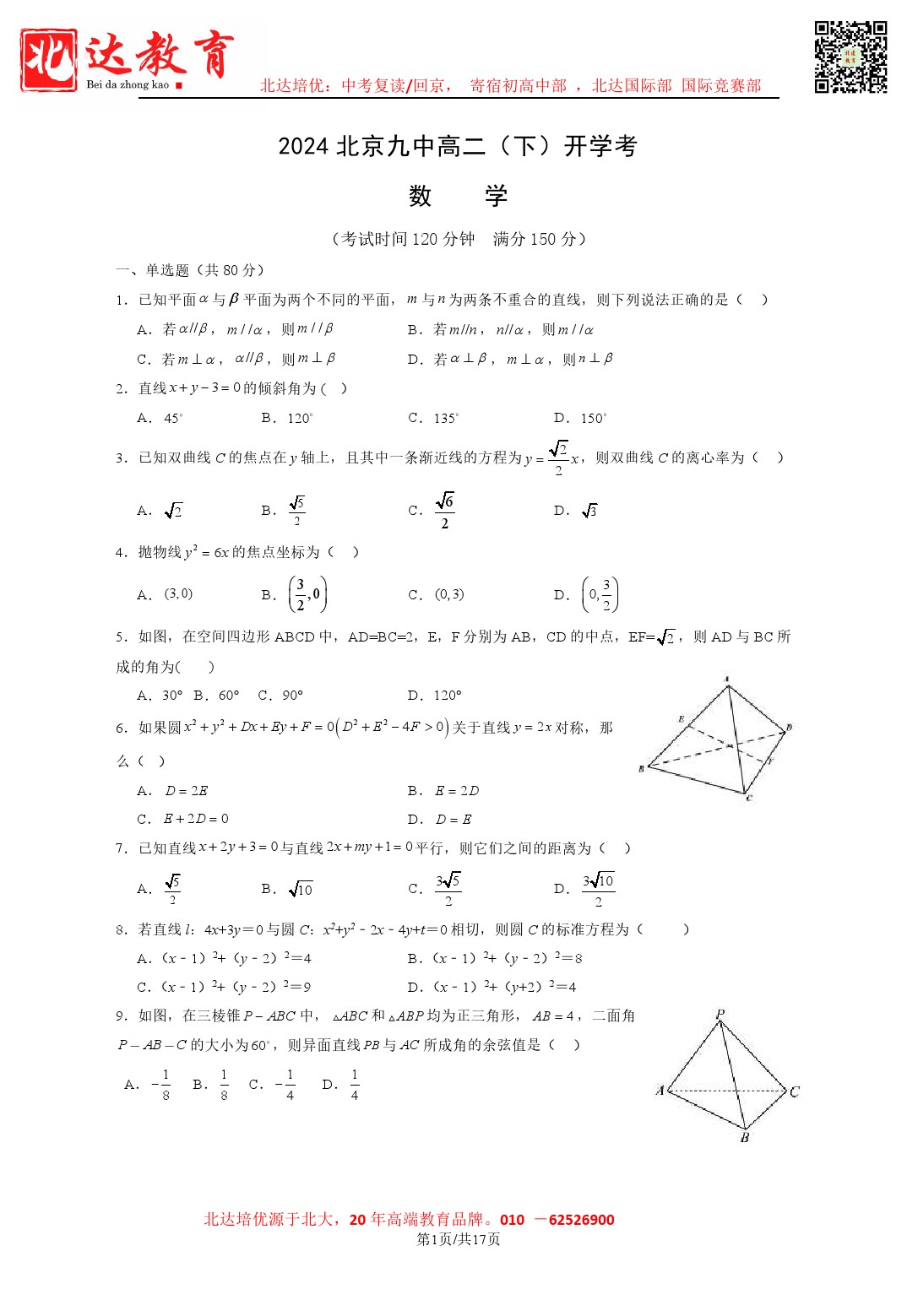 2024北京各中学高二开学考已结束,为了方便同学们查找相关试题,admw360高考网特意整理了2023-2024学年北京九中高二下开学考数学试题及答案,需要的同学赶紧下载练习吧。