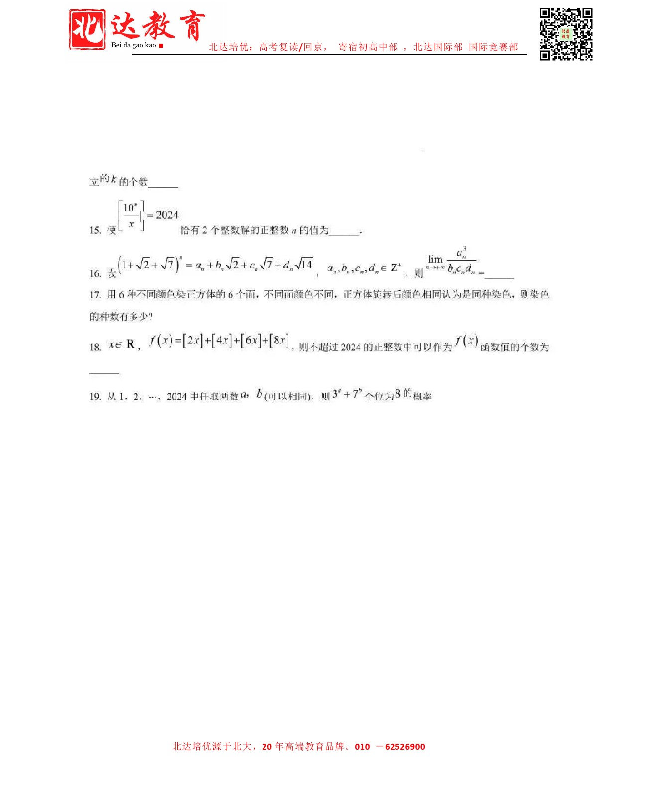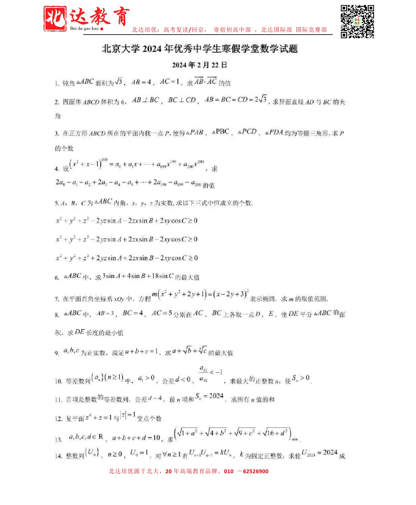 admw360教育整理了2024年北京大学优秀中学生寒假学堂数学试题及答案解析,分享给同学们。