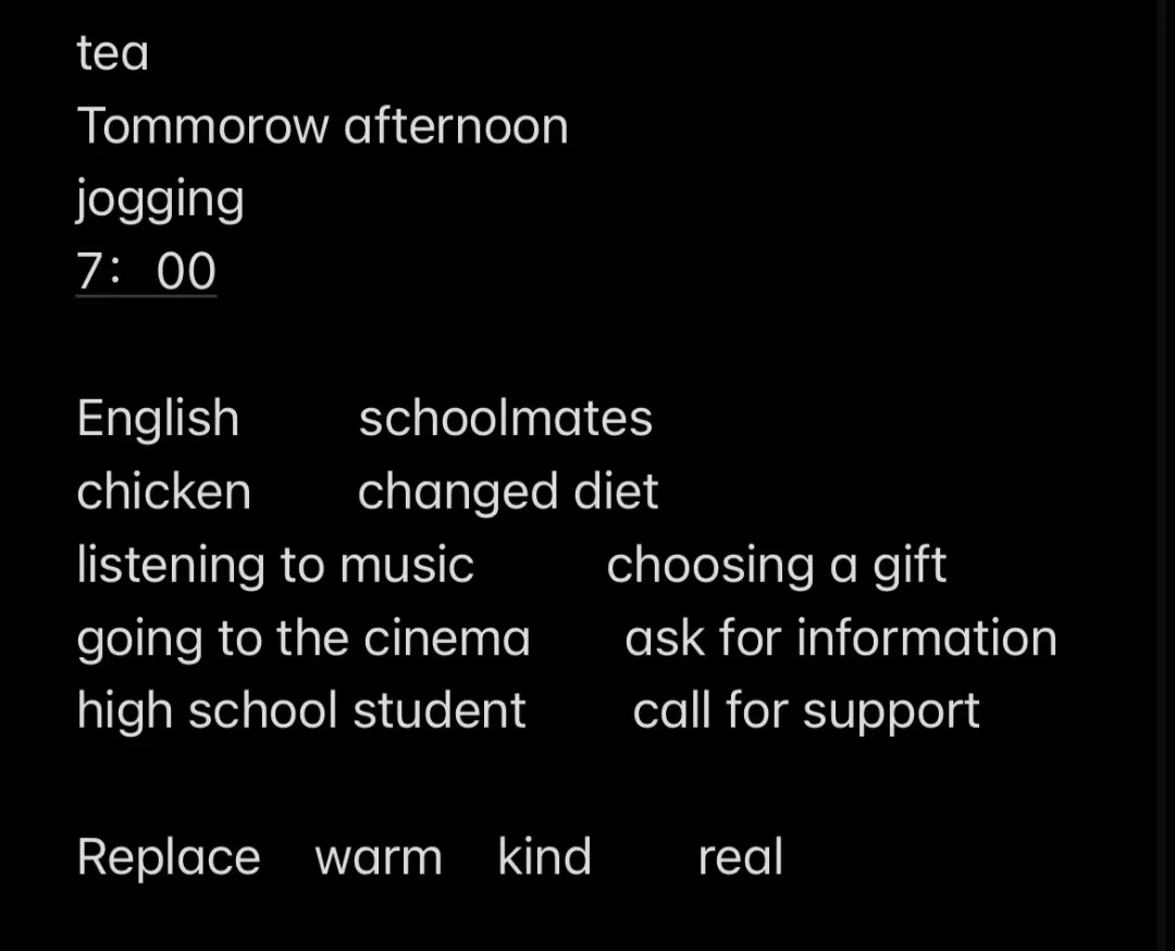 1.tea 2.tomorrow afternoon 3.jogging 4.7am 5.english 6.schoolmates 7.chicken 8.diet 9.listen music 10.choosing gift 11.cinema 12.ask for informationg 13.high school student 14.call for support