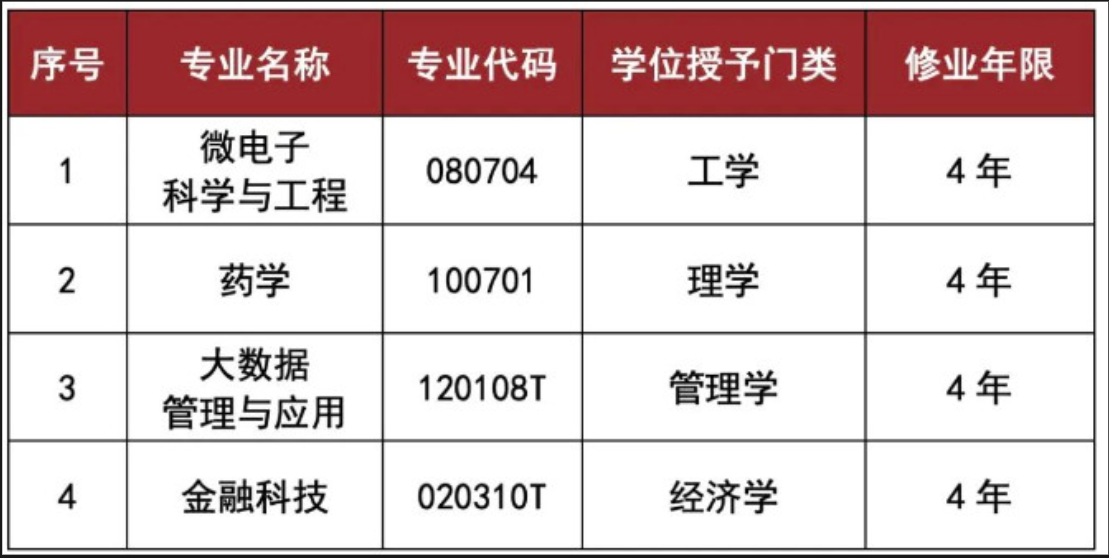 湖南大学新增微电子科学与工程、药学、大数据管理与应用、金融科技等四个本科专业,admw360教研组收集并整理,以下为专业信息供大家参考: