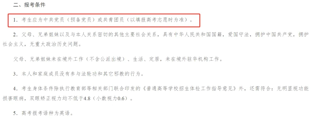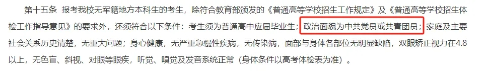 2023报考条件:无军籍本科地方招生只收中共党员或共青团员的应届毕业生。