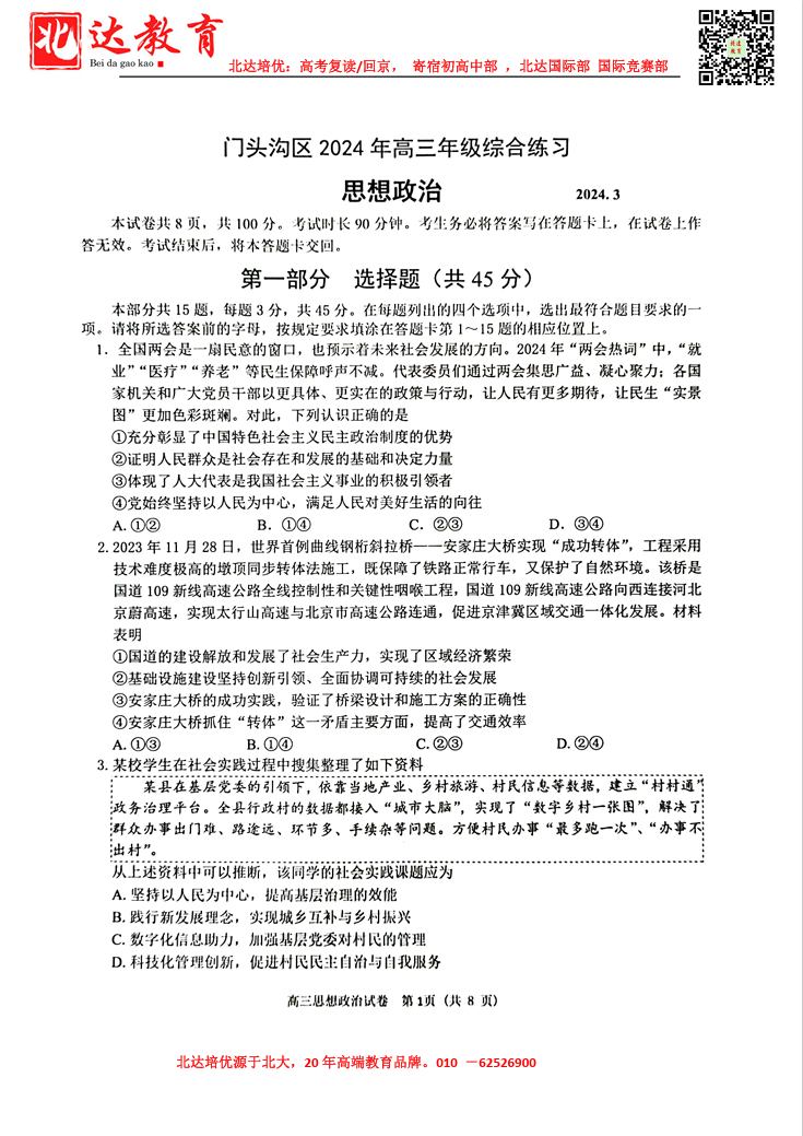2024年北京门头沟高三一模开考,admw360教研组收集并整理了2024北京门头沟高三一模政治试题及答案,分享给同学们。