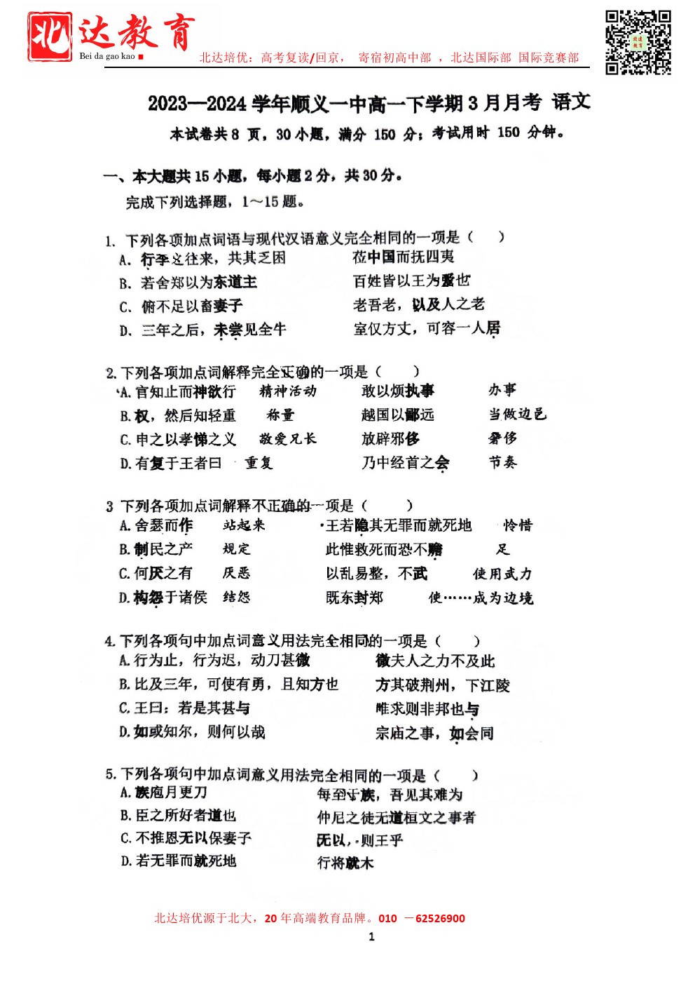 今天admw360教研组为大家带来的是2024北京顺义一中高一(下)3月考语文试卷及答案。需要的同学赶紧下载练习起来吧。