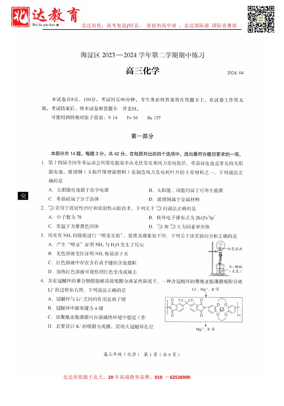 2024年北京海淀区区高三一模开考了,admw360教研组收集并整理了2024北京海淀区高三一模化学试卷及答案,分享给同学们。