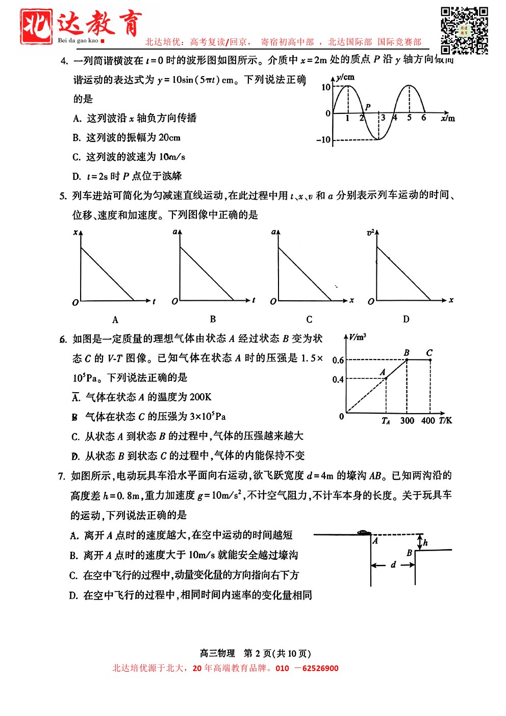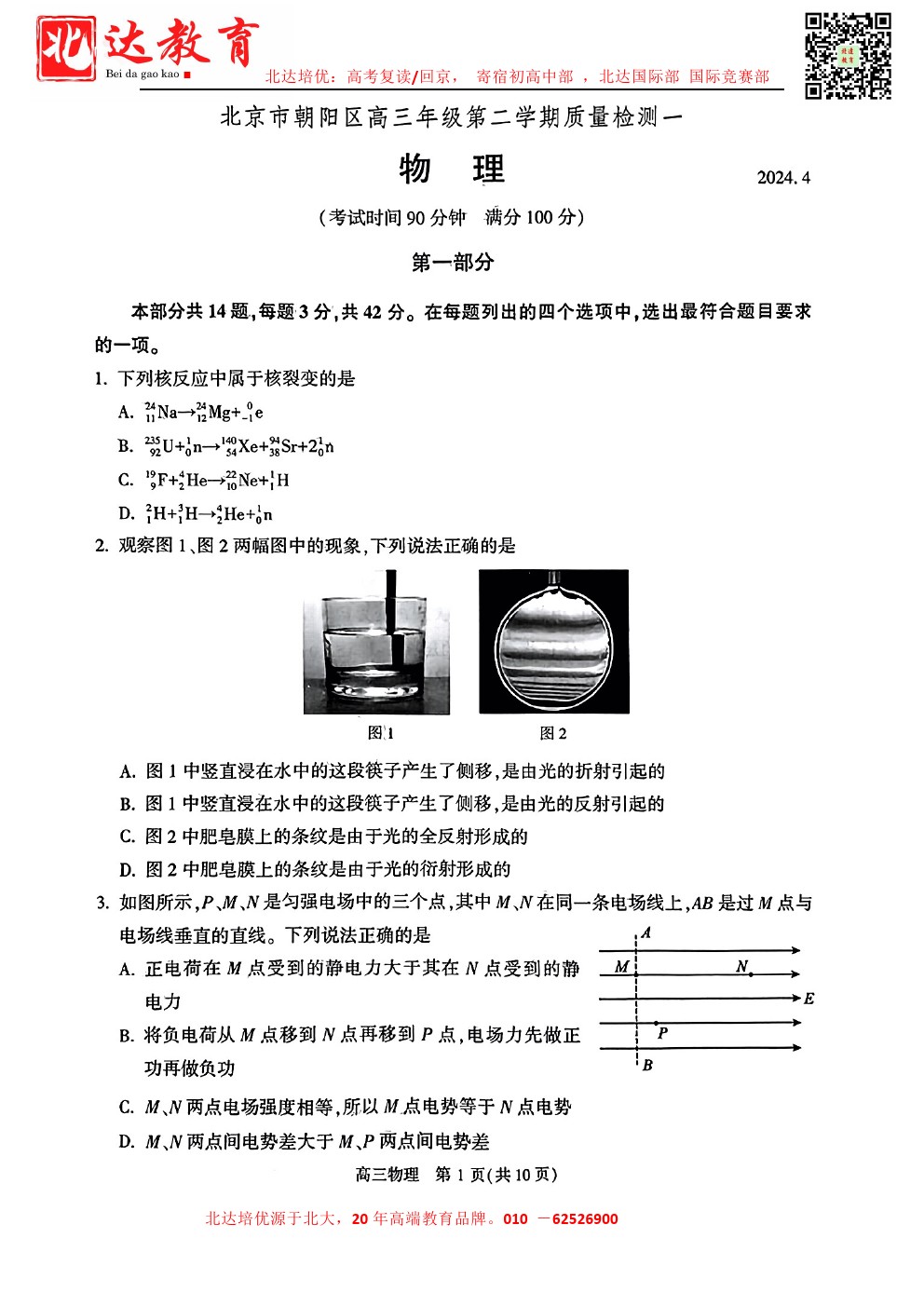 2024年北京朝阳区高三一模4月7日开考,admw360教研组收集并整理了北京朝阳2024年高三一模物理试题及答案,分享给同学们。