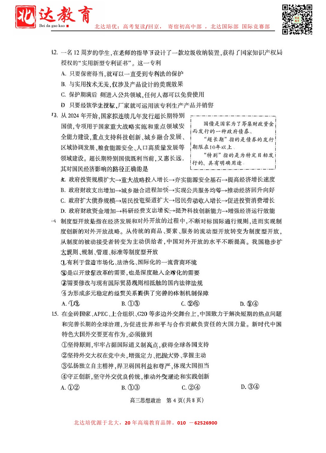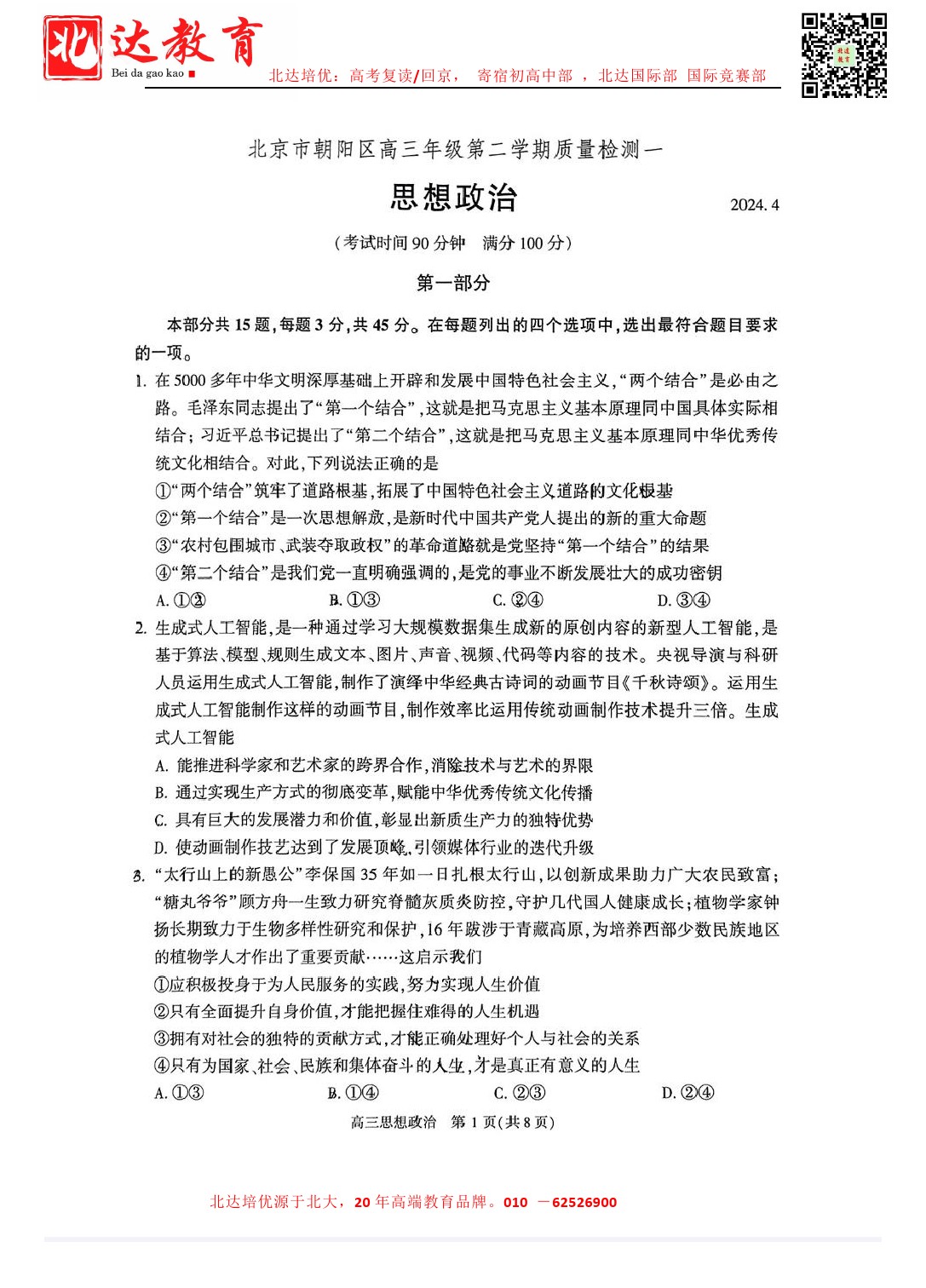 2024年北京朝阳区高三一模4月7日开考,admw360教研组收集并整理了北京朝阳2024年高三一模政治试题及答案,分享给同学们。