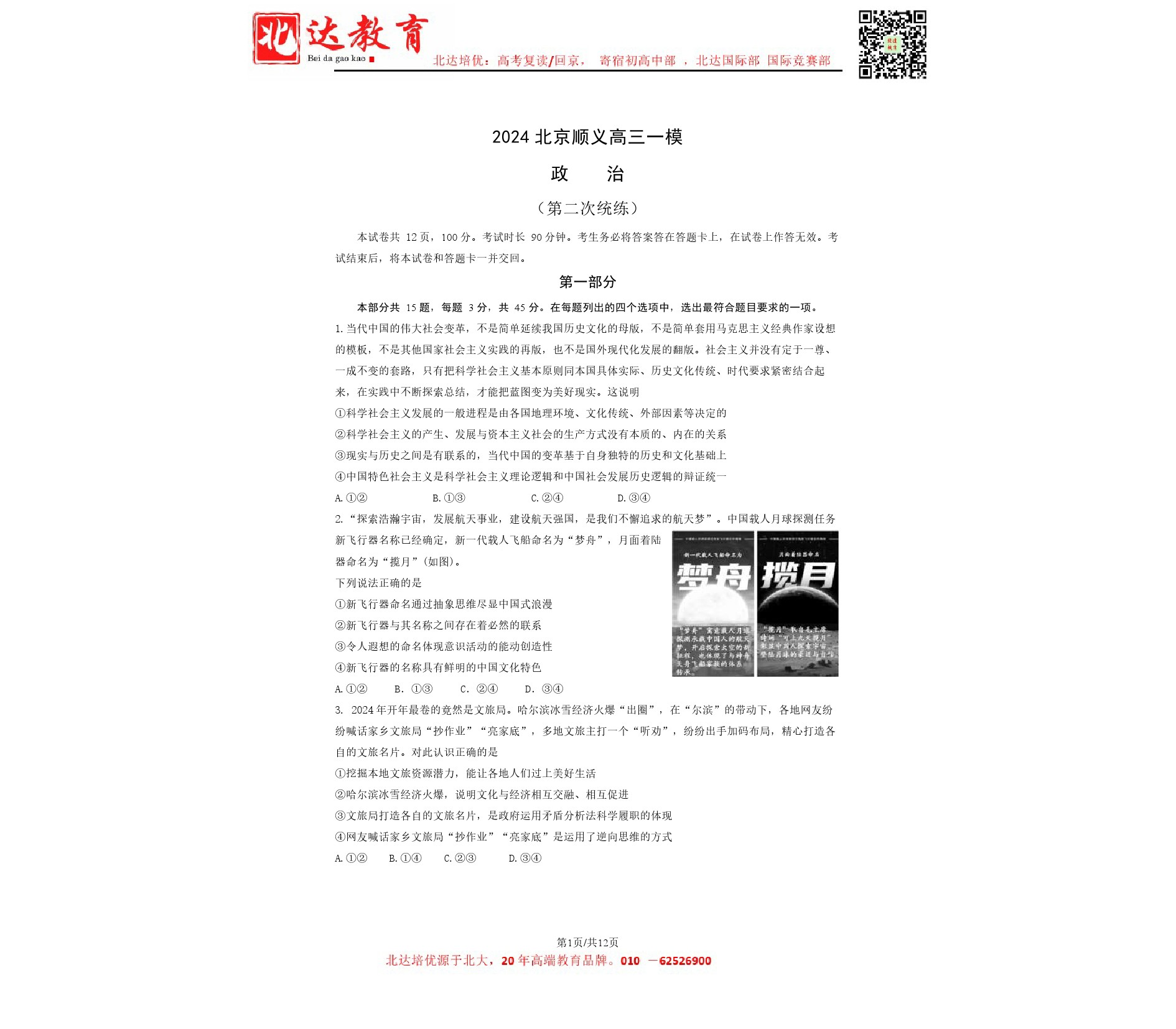 2024年北京顺义区高三一模开考,admw360教育整理了2024年北京顺义区高三一模政治试题及答案,分享给同学们。
