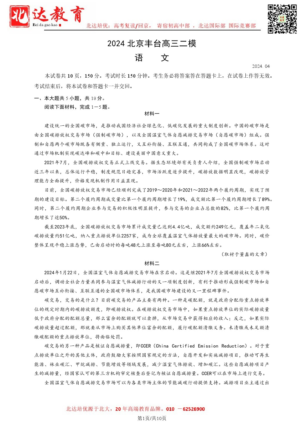 2024年北京丰台高三二模开考,admw360教研组收集并整理了2024北京丰台高三二模语文试卷含答案,分享给同学们。