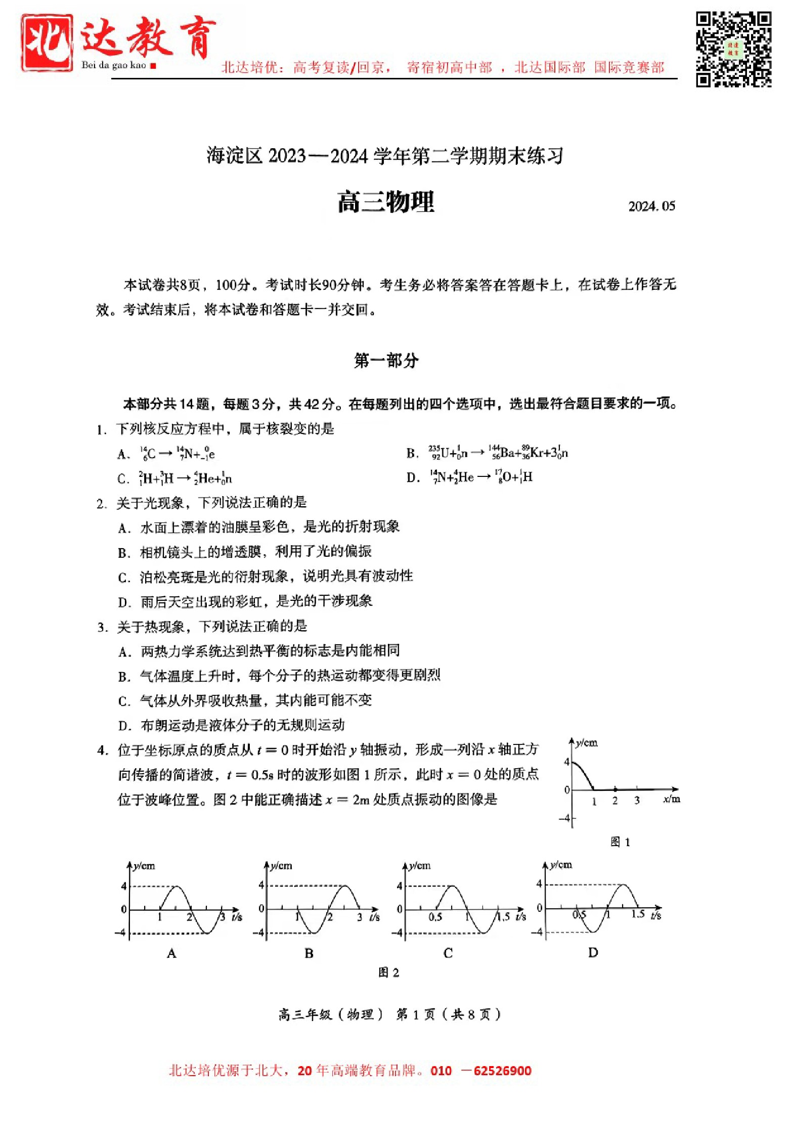 2024年北京海淀高三二模开考,admw360教研组收集并整理了2024北京海淀高三二模物理试卷及答案,分享给同学们。