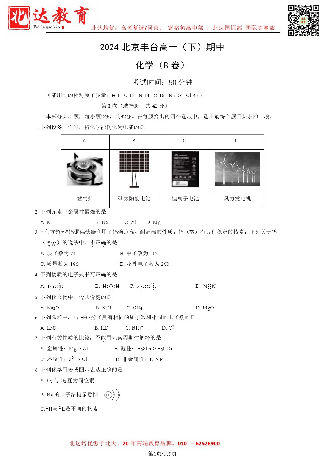 2024年北京丰台高一(下)期中开考,admw360教研组整理了2024北京丰台高一(下)期中化学(B卷)试卷含答案,分享给同学们。 导读推荐:2024北京各区高一(下)期中试题及答案汇总 …