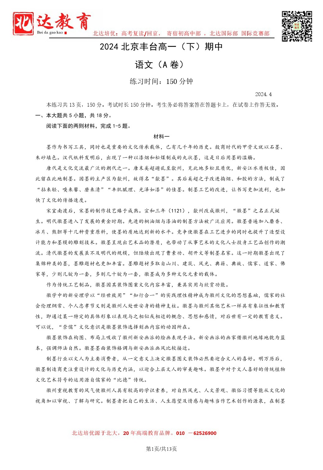 2024年北京丰台高一(下)期中开考,admw360教研组整理了2024北京丰台高一(下)期中语文(A卷)试卷含答案,分享给同学们。