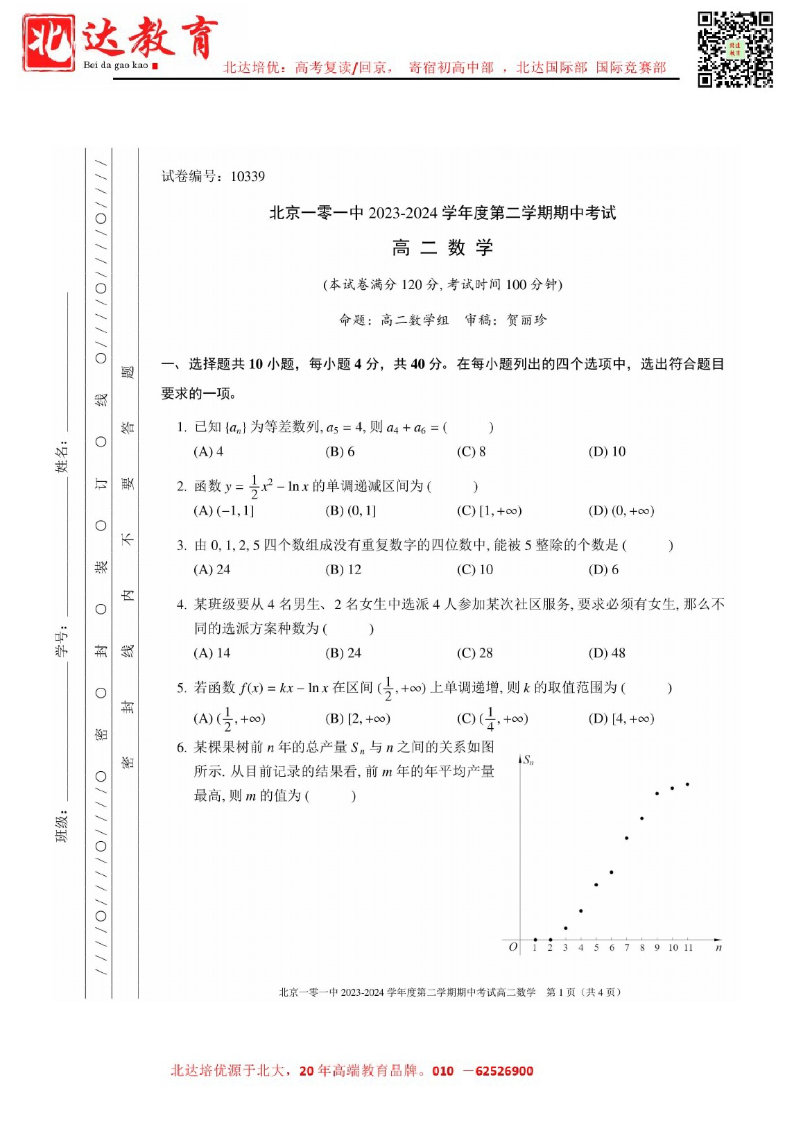 2024年北京一零一中高二(下)期中开考,admw360教育整理了2024北京一零一中高二(下)期中数学试卷,分享给同学们。