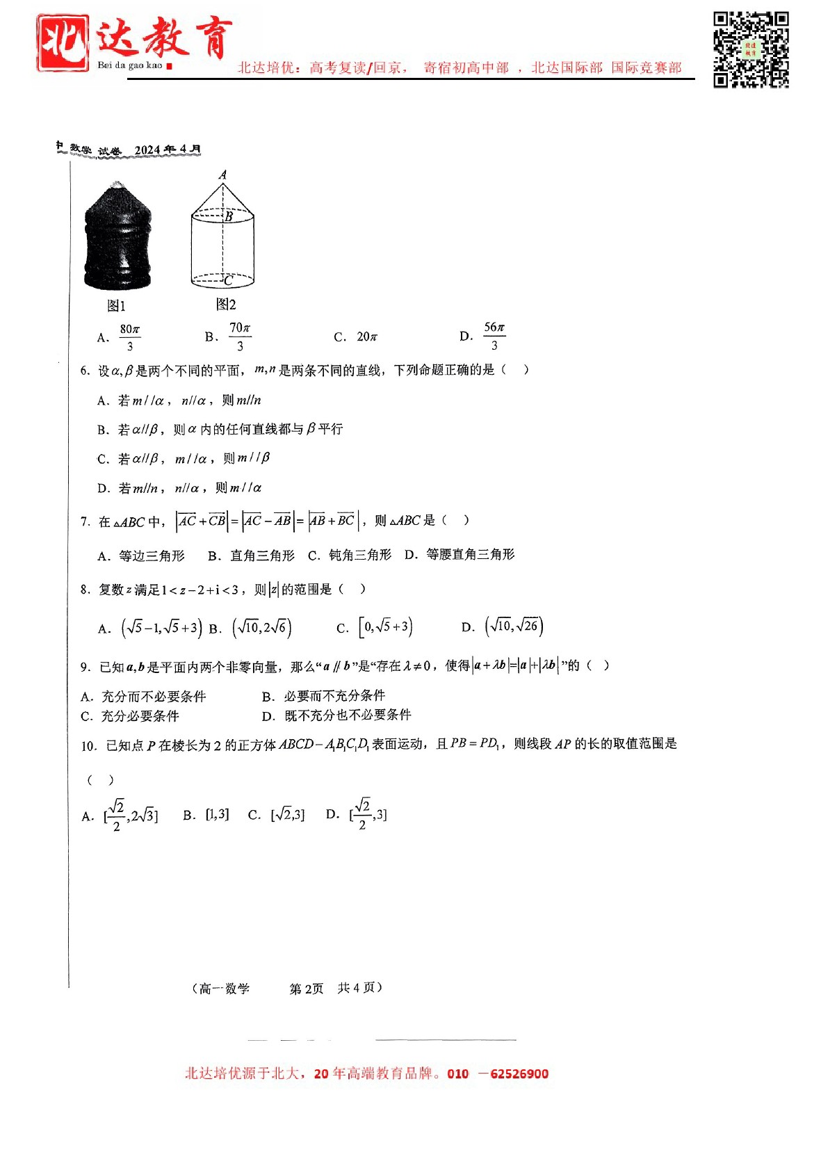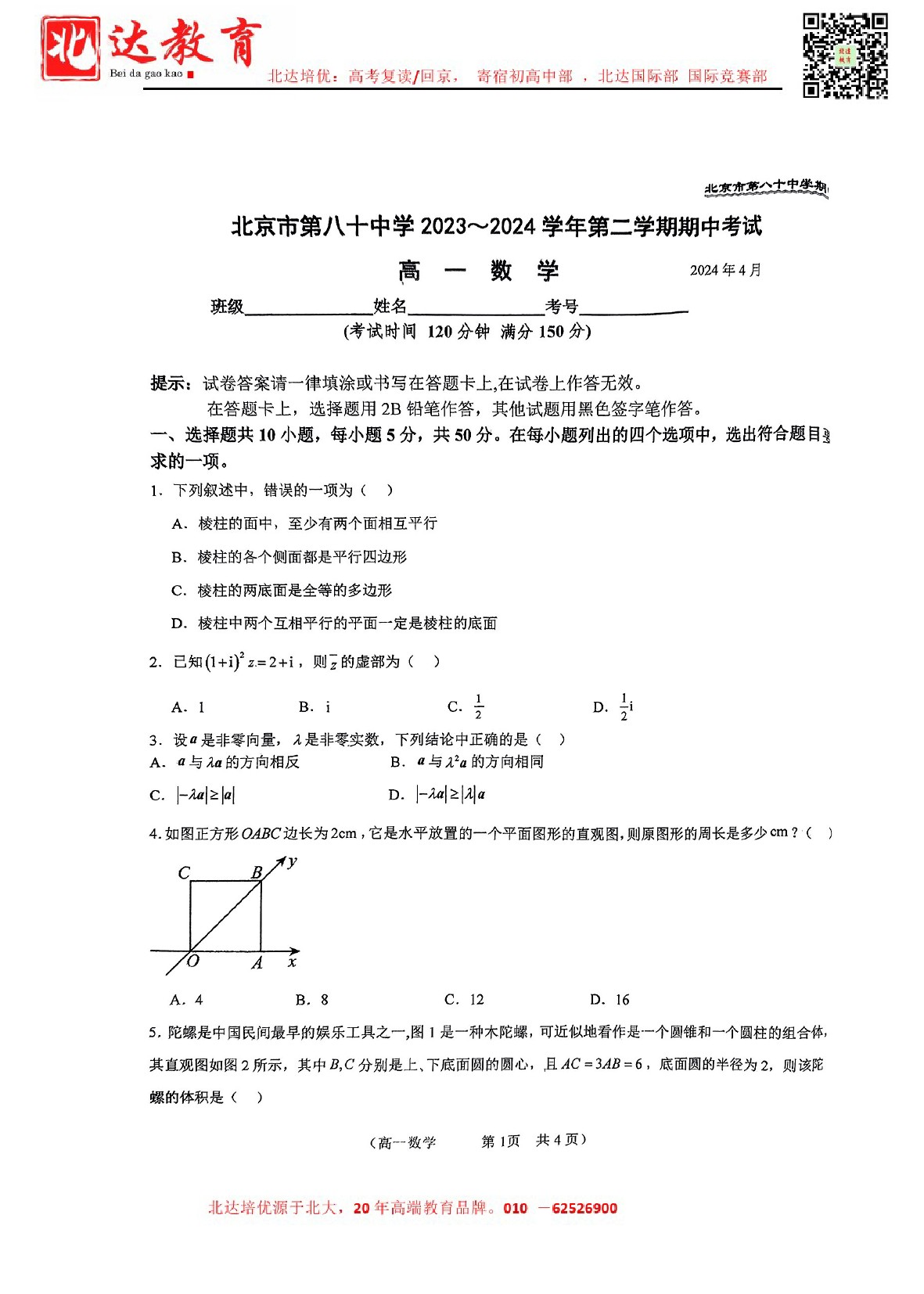 2024年北京八十中高一(下)期中开考,admw360教研组整理了2024北京八十中高一(下)期中数学试卷,分享给同学们。 导读推荐:2024北京各区高一(下)期中试题及答案汇总 北京admw360全…