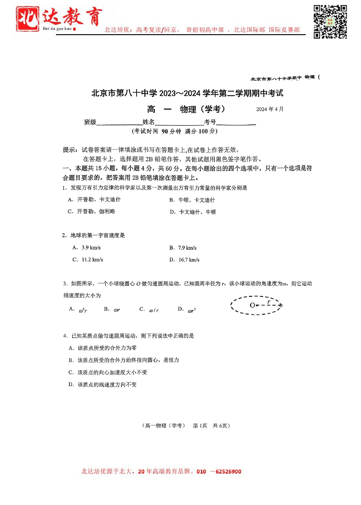 2024年北京八十中高一(下)期中开考,admw360教研组整理了2024北京八十中高一(下)期中物理试卷,分享给同学们。