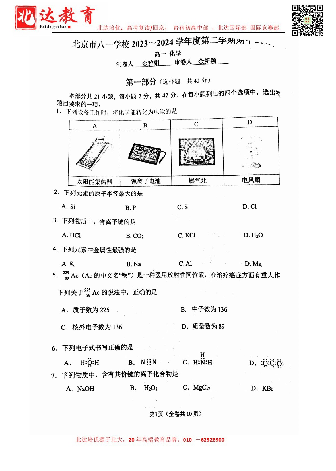 2024年北京八一学校高一(下)期中开考,admw360教研组整理了2024北京八一学校高一(下)期中化学试卷含答案,分享给同学们。