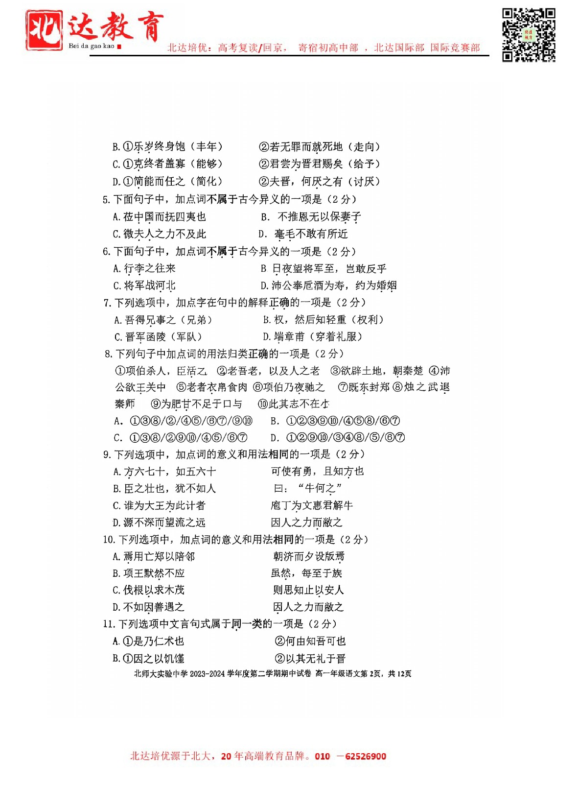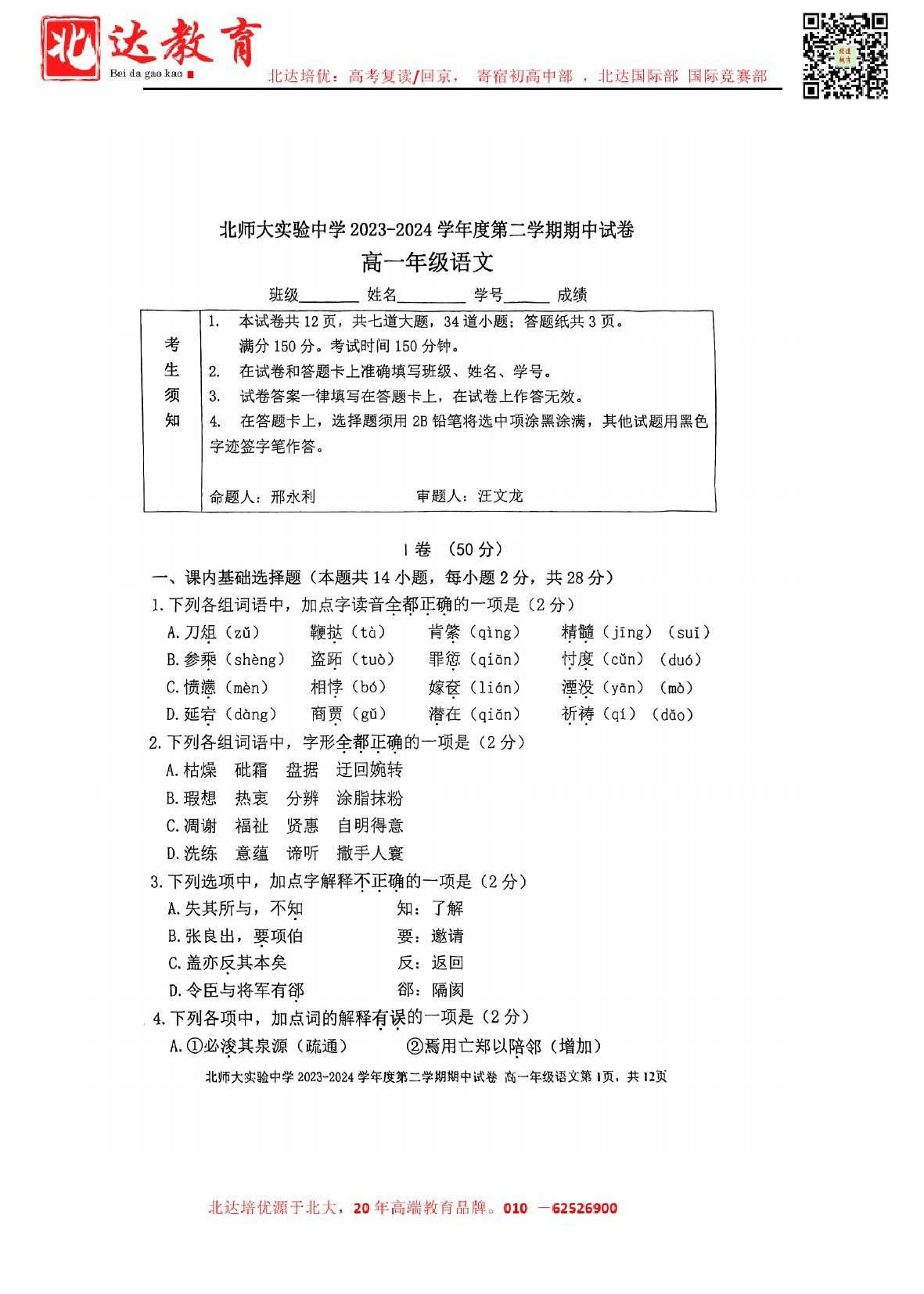 2024年北京北师大实验中学高一(下)期中开考,admw360教研组整理了2024北京北师大实验中学高一(下)期中语文试卷,分享给同学们。