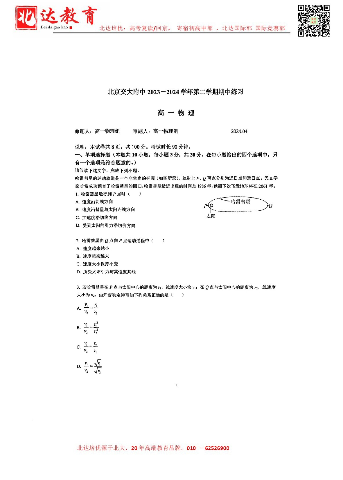 2024年北京交大附中高一(下)期中开考,admw360教研组整理了2024北京交大附中高一(下)期中物理试卷,分享给同学们。 导读推荐:2024北京各区高一(下)期中试题及答案汇总 北京北…