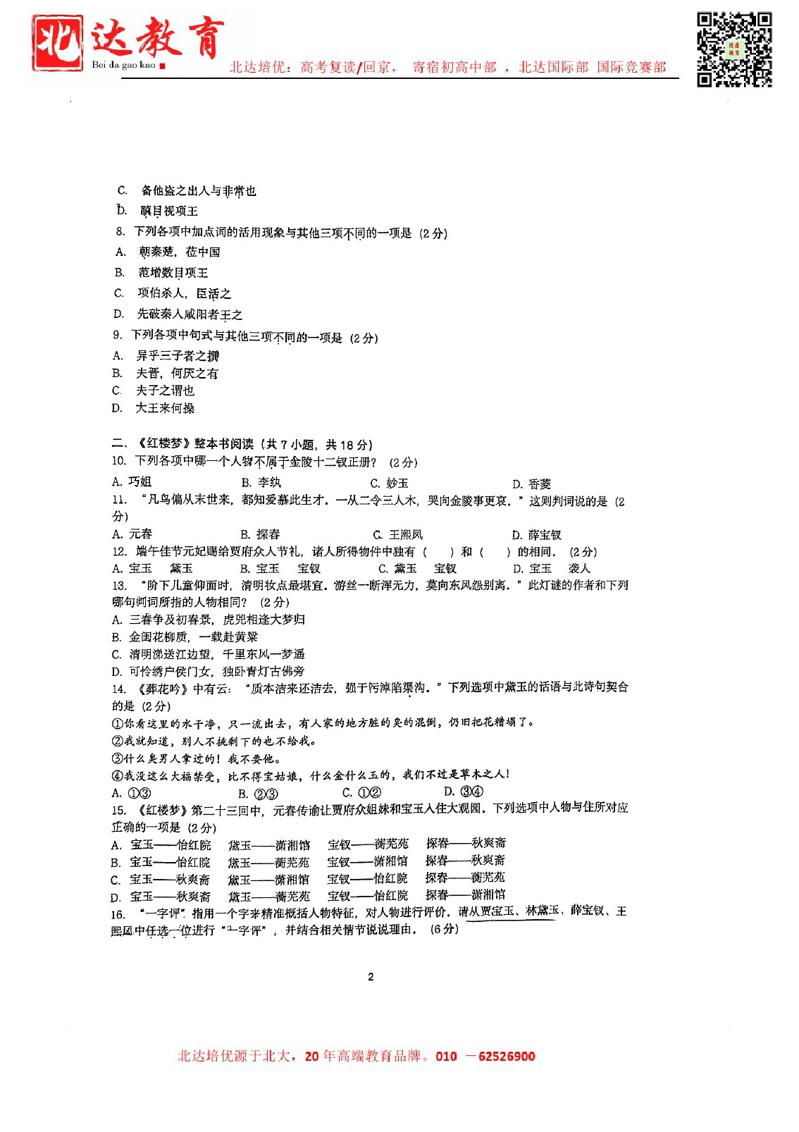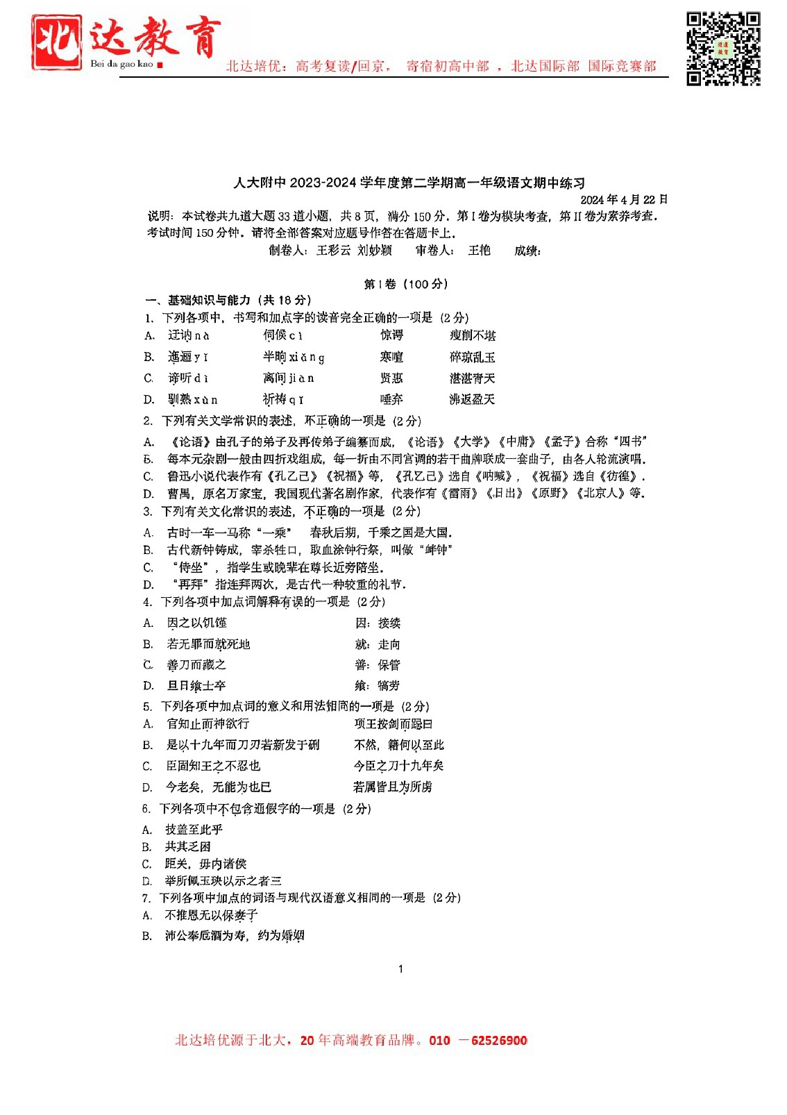 2024年北京人大附中高一(下)期中开考,admw360教研组整理了2024北京人大附中高一(下)期中语文试卷含答案,分享给同学们。