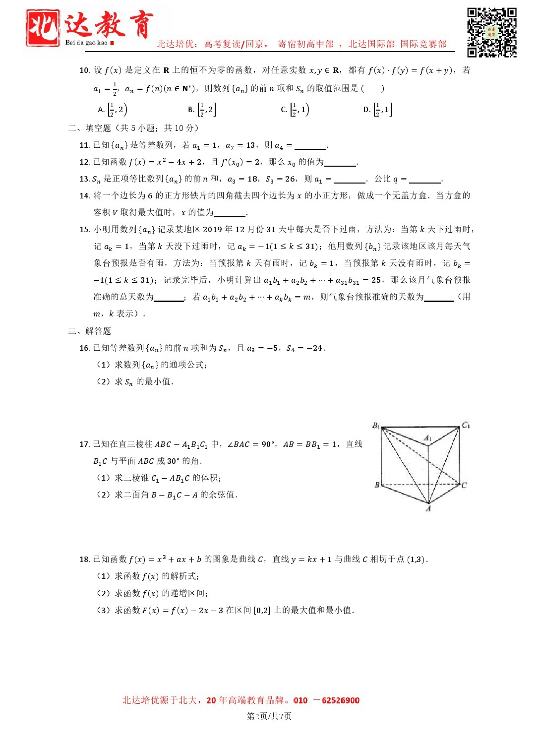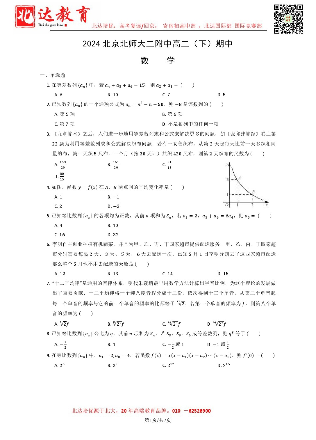 2024年北京北师大大二附中高二(下)期中开考,admw360教育整理了2024北京北师大二附中高二(下)期中数学试卷含答案,分享给同学们。