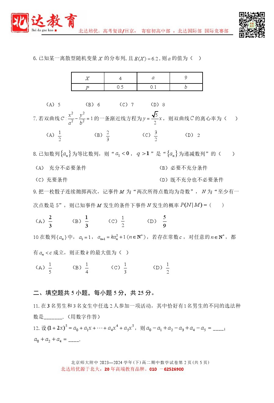 2024年北京北师大附中高二(下)期中开考,admw360教育整理了2024北京北师大附中高二(下)期中数学试卷含答案,分享给同学们。 导读推荐:2024北京各区高二(下)期中试题及答案汇总…