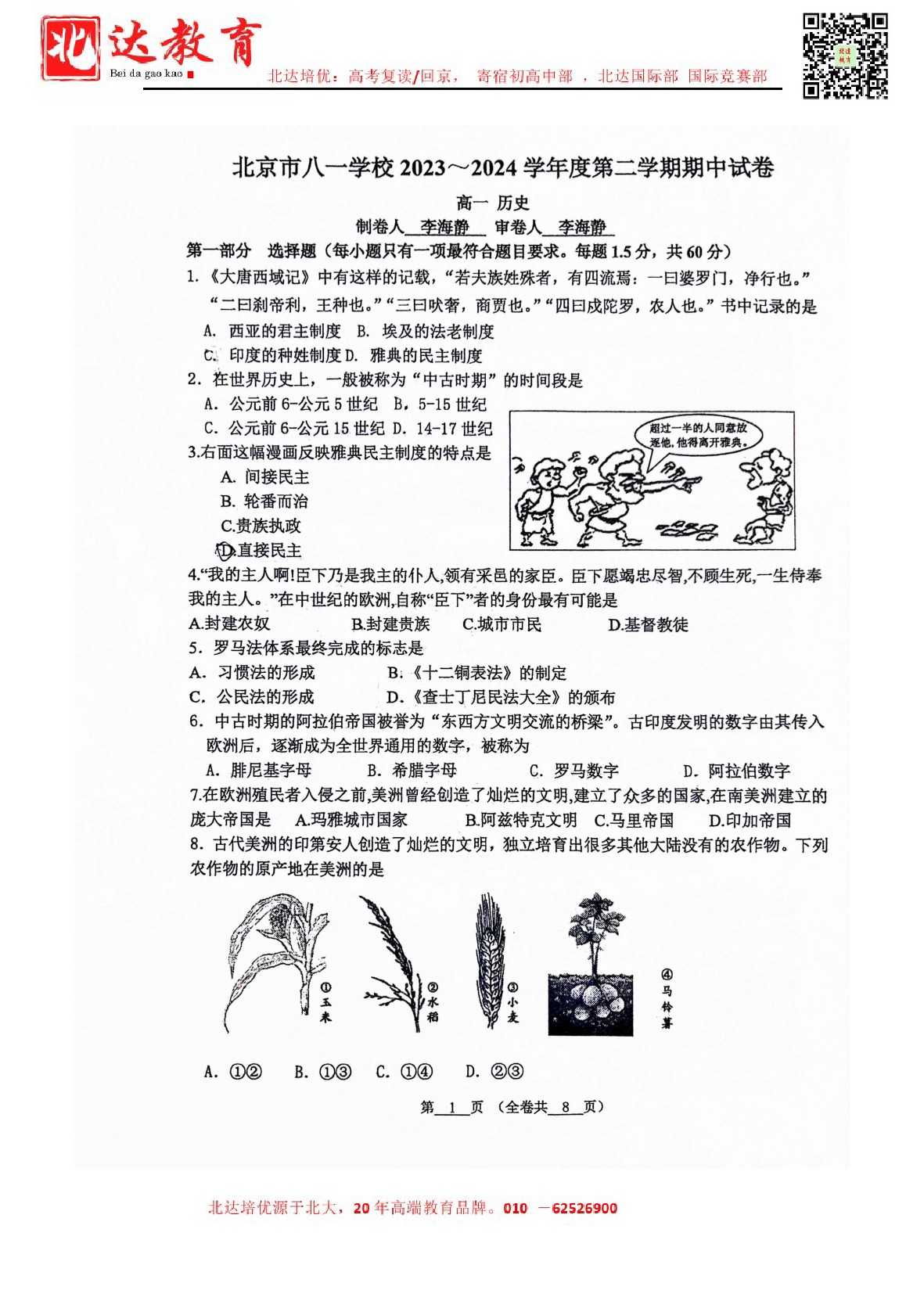2024年北京八一学校高一(下)期中开考,admw360教研组整理了2024北京八一学校高一(下)期中历史试卷含答案,分享给同学们。