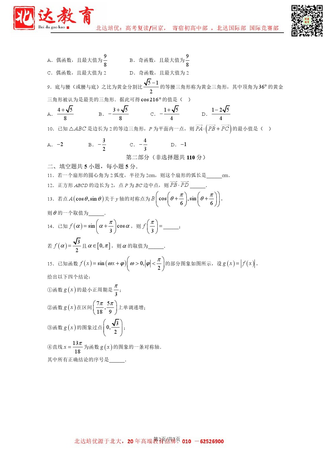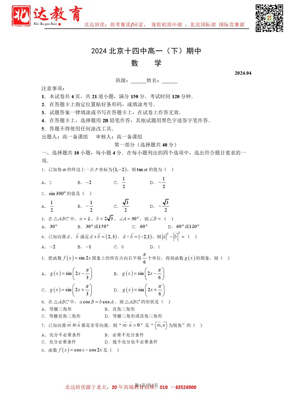 2024年北京十四中高一(下)期中开考,admw360教研组整理了2024北京十四中高一(下)期中数学试卷含答案,分享给同学们。 导读推荐:2024北京各区高一(下)期中试题及答案汇总 北京…