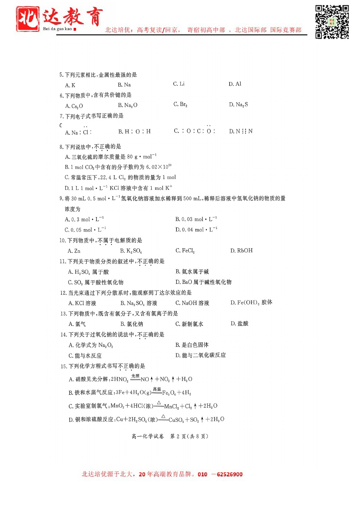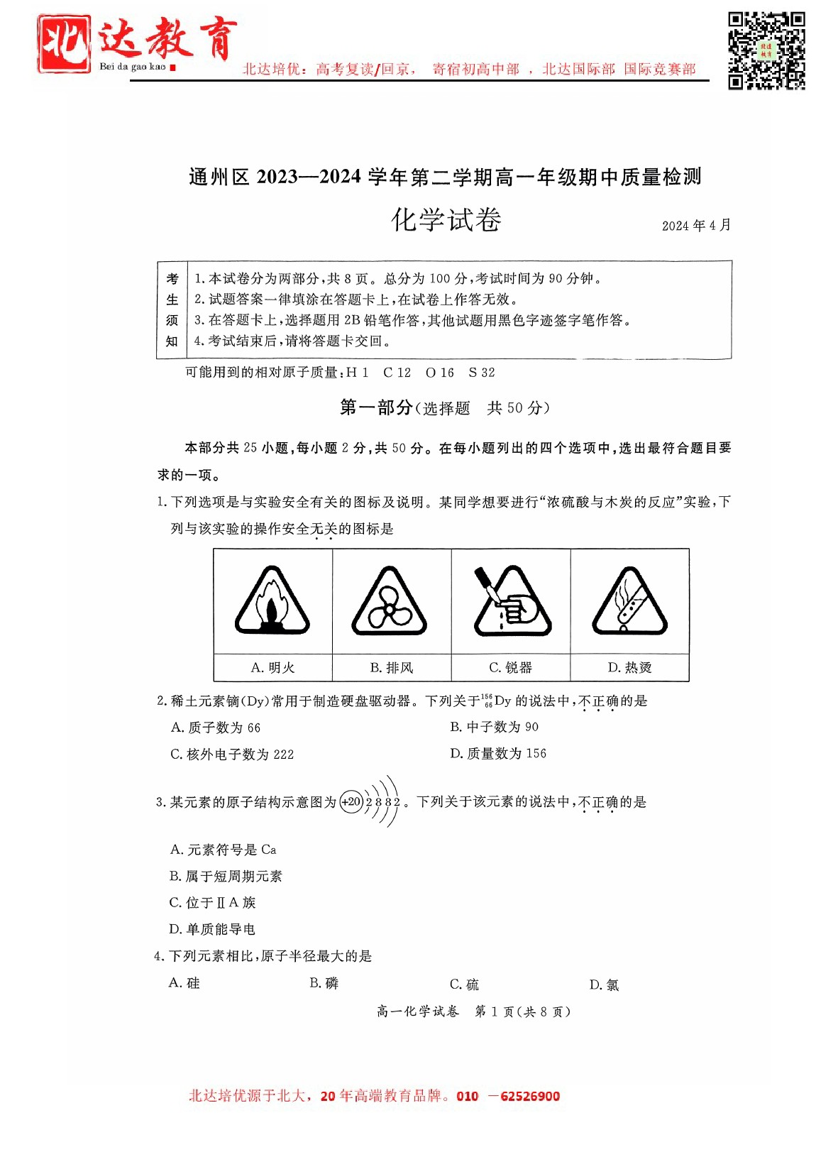 2024年北京通州高一(下)期中开考,admw360教研组整理了2024北京通州高一(下)期中化学试卷含答案,分享给同学们。 导读推荐:2024北京各区高一(下)期中试题及答案汇总 北京admw360…
