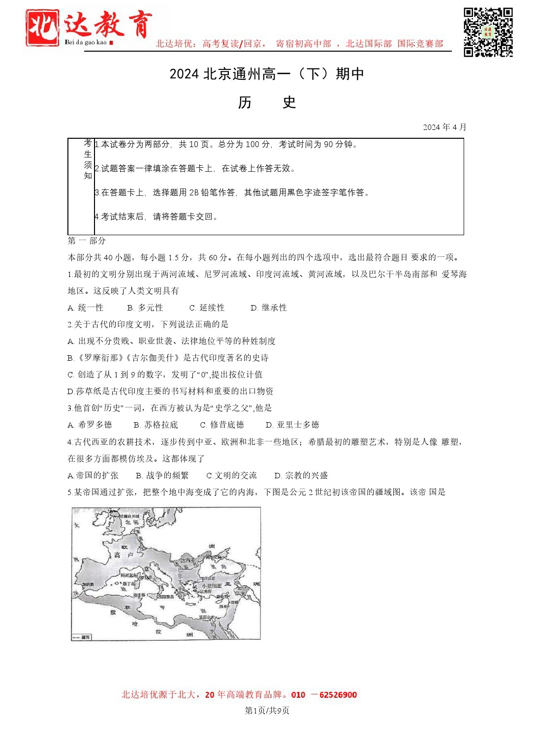 2024年北京通州高一(下)期中开考,admw360教研组整理了2024北京通州高一(下)期中历史试卷含答案,分享给同学们。