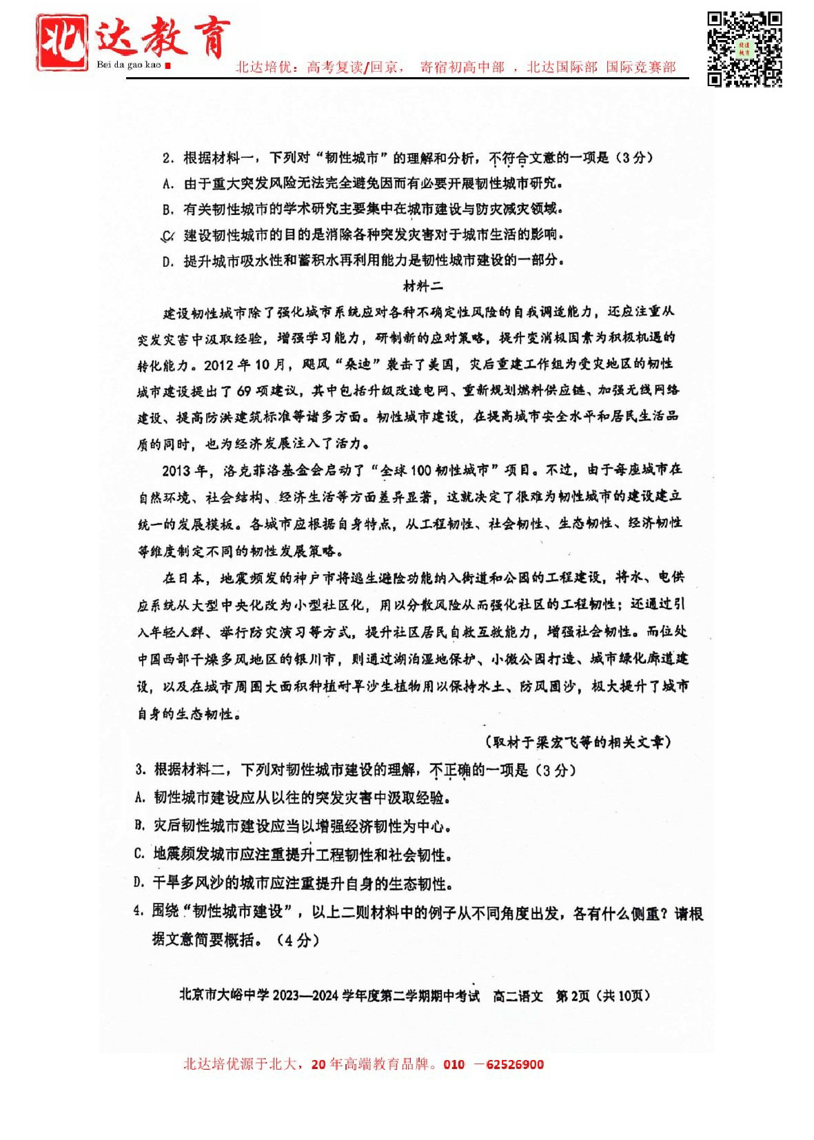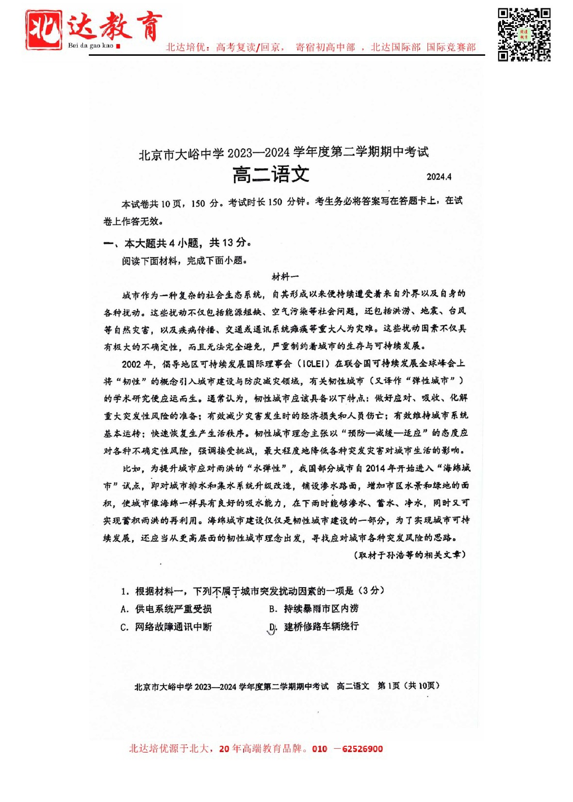 2024年北京大峪中学高二(下)期中开考,admw360教育整理了2024北京大峪中学高二(下)期中语文试卷含答案,分享给同学们。