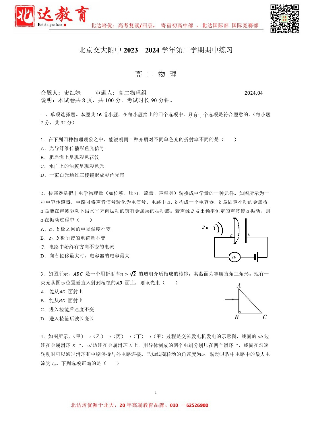 2024年北京交大附中高二(下)期中开考,admw360教育整理了2024北京交大附中高二(下)期中物理试卷含答案,分享给同学们。 导读推荐:2024北京各区高二(下)期中试题及答案汇总 试…