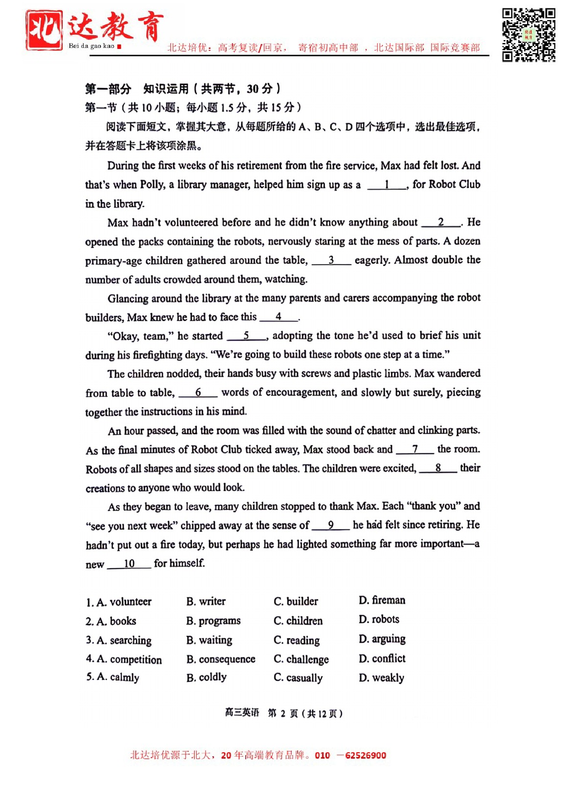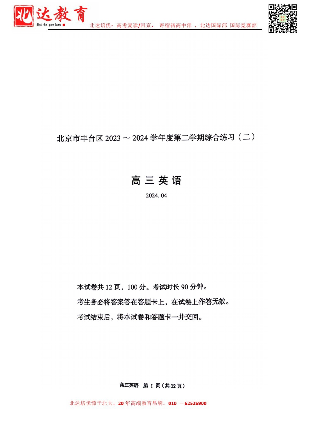 2024年北京丰台高三二模开考,admw360教研组收集并整理了2024北京丰台高三二模英语试卷及答案,分享给同学们。