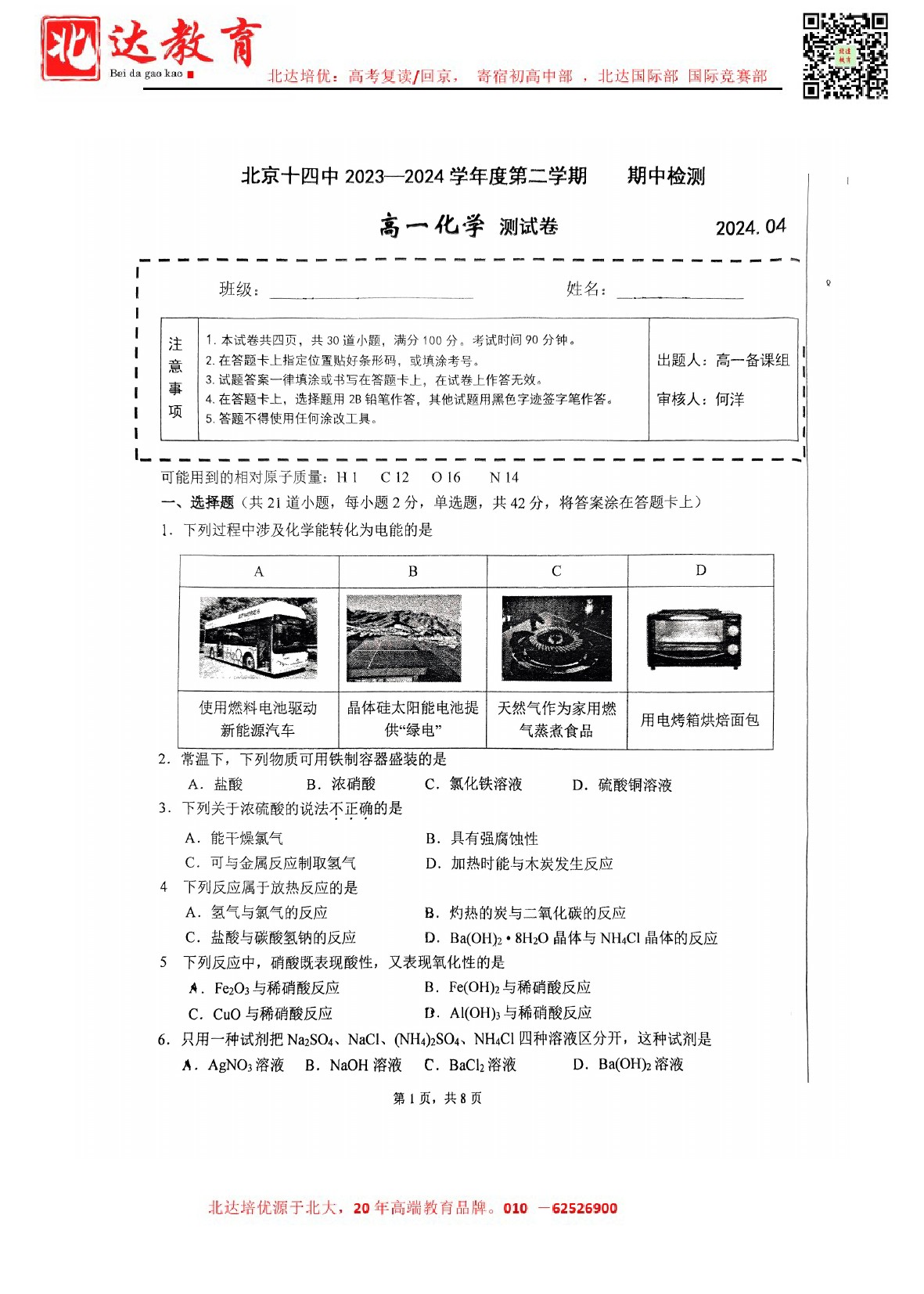 2024年北京十四中高一(下)期中开考,admw360教研组整理了2024北京十四中高一(下)期中化学试卷,分享给同学们。 导读推荐:2024北京各区高一(下)期中试题及答案汇总 北京admw360全…