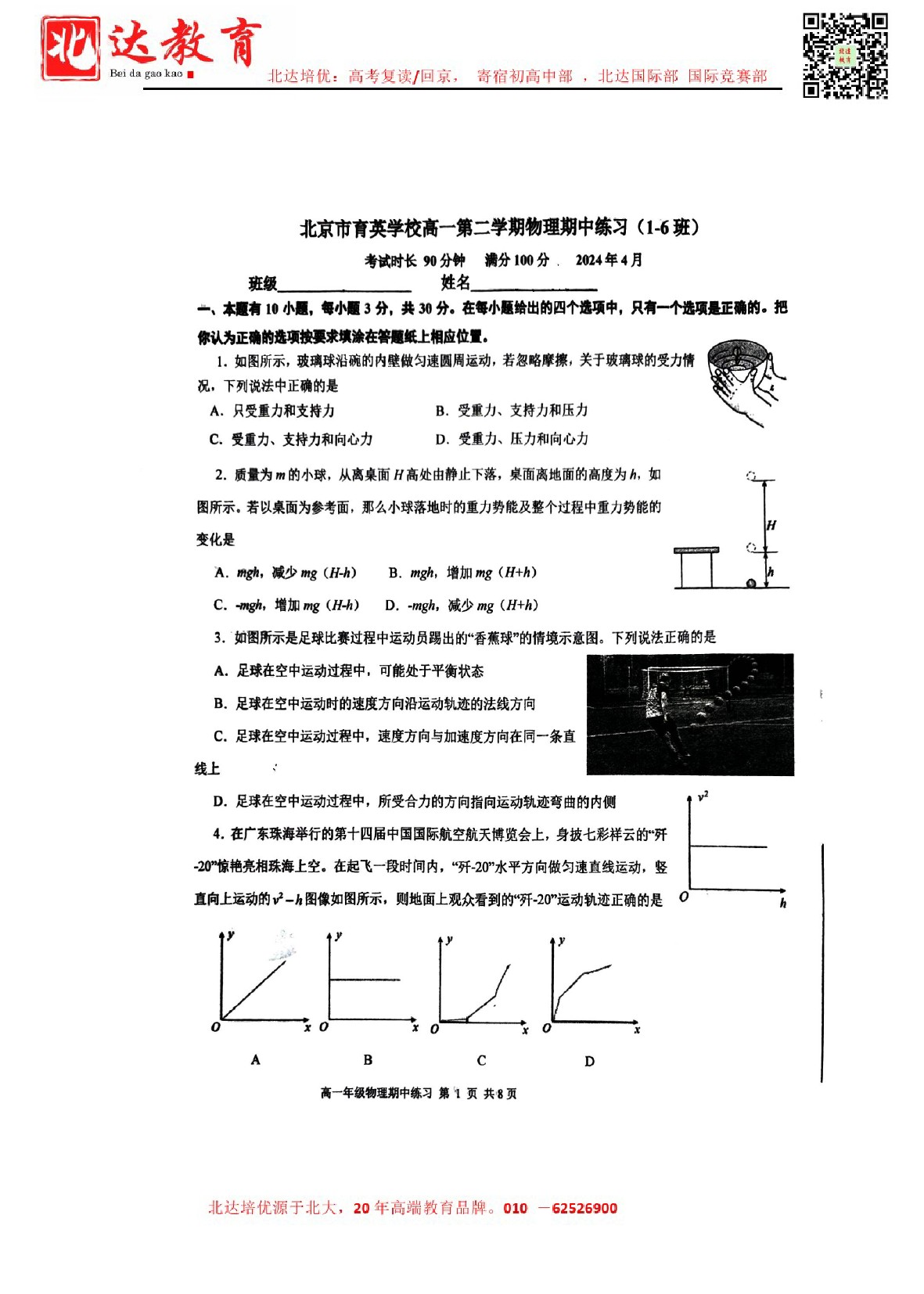 2024年北京育英学校高一(下)期中开考,admw360教研组整理了2024北京育英学校高一(下)期中物理(1-6班)试卷,分享给同学们。