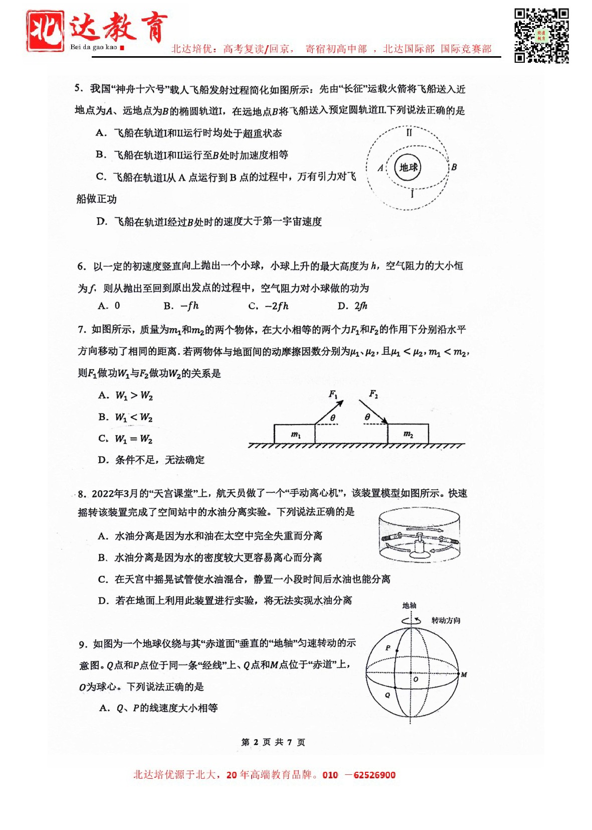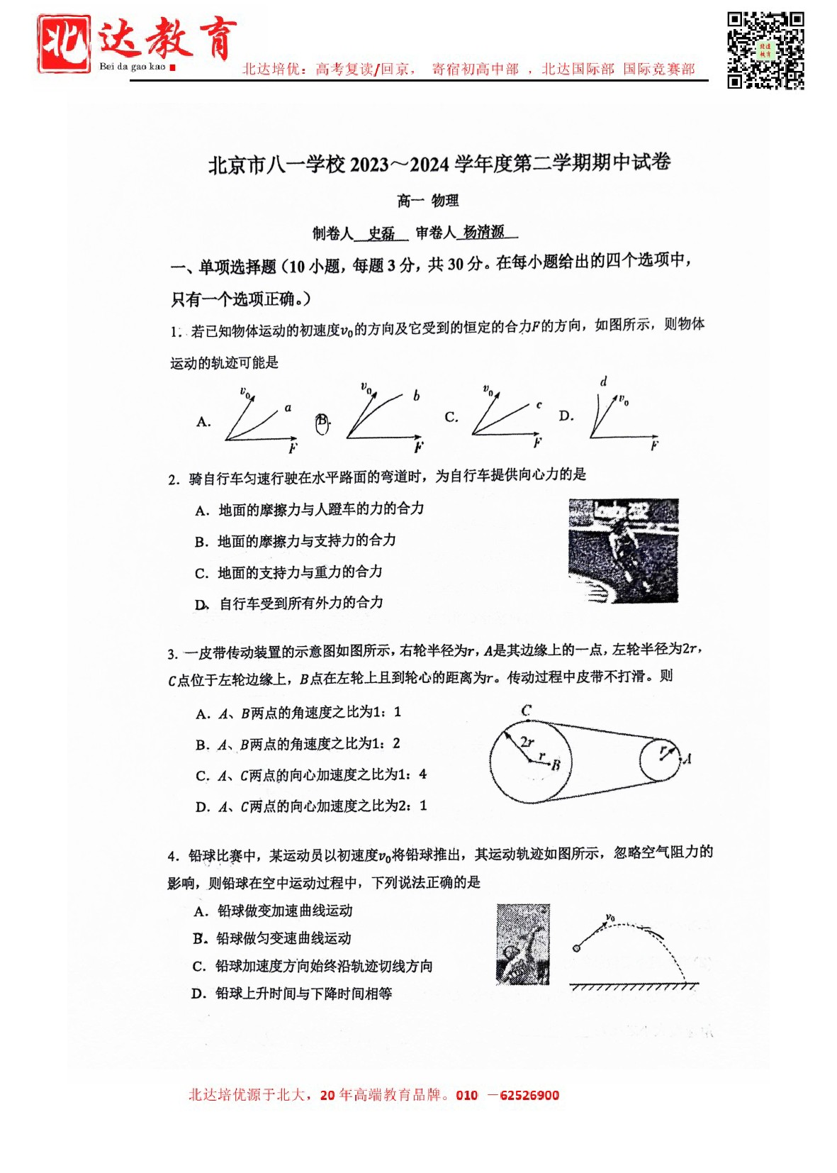 2024年北京八一学校高一(下)期中开考,admw360教研组整理了2024北京八一学校高一(下)期中物理试卷含答案,分享给同学们。