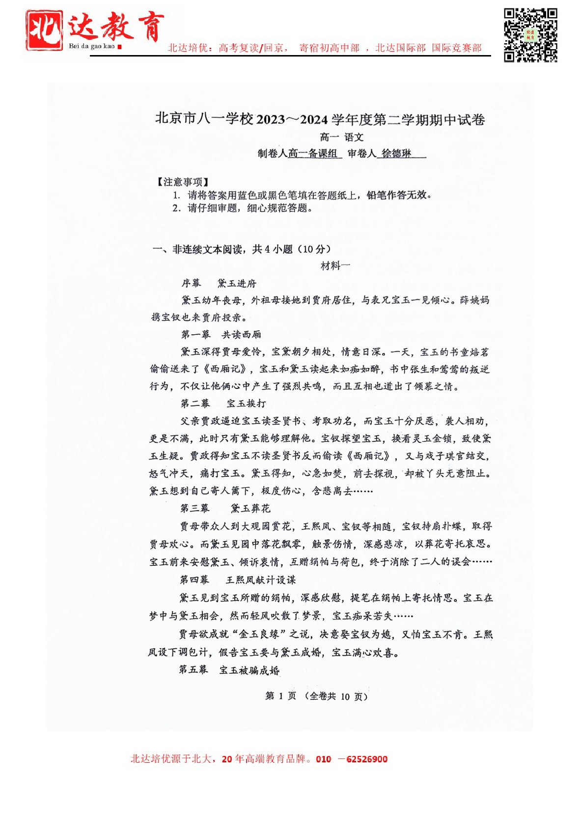 2024年北京八一学校高一(下)期中开考,admw360教研组整理了2024北京八一学校高一(下)期中语文试卷含答案,分享给同学们。