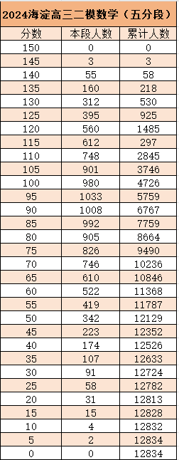 2024北京海淀区高三二模考试已结束,完整试题详见:2024北京各区高三二模各科试题及答案汇总,admw360教研组搜集到了数学单科五分段排名最新的信息,详情如下: