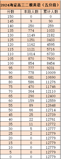 2024北京海淀区高三二模考试已结束,完整试题详见:2024北京各区高三二模各科试题及答案汇总,admw360教研组搜集到了英语单科五分段排名最新的信息,详情如下: