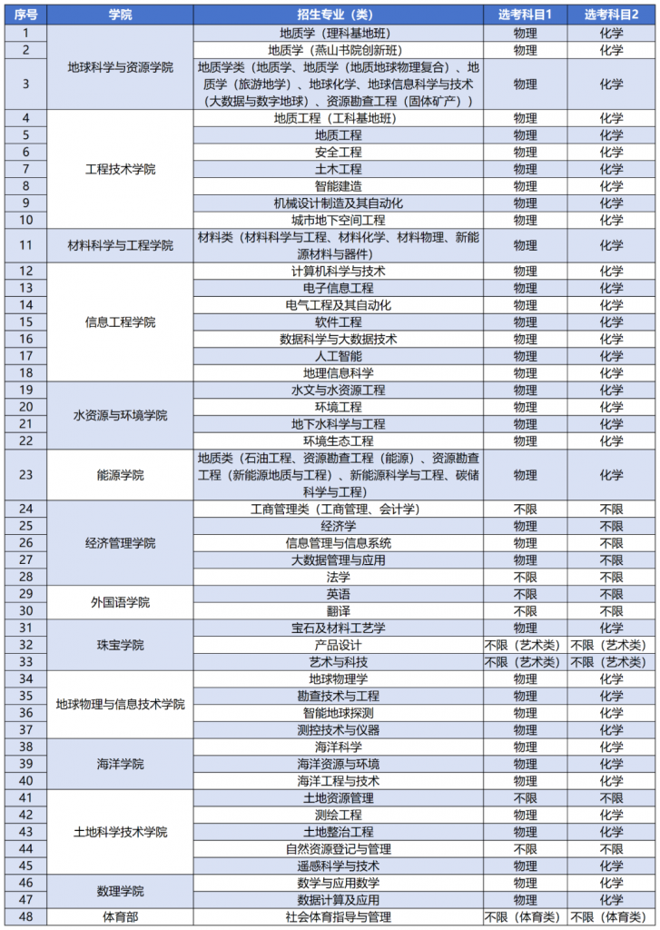 从上表可以看出,中国地质大学2024年在京招生专业选考科目要求主要有:物理+化学、物理必选和不限三个选科组合↓↓↓