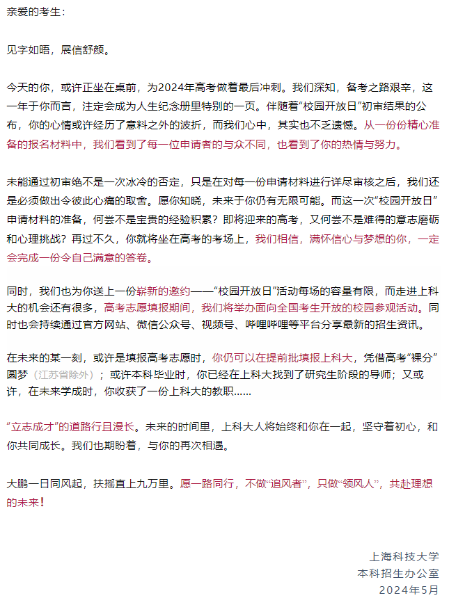 校园开放日活动通过以综合面试为主的多样性活动全面考察考生综合素质,旨在向考生和家长展示介绍上科大办学理念和发展状况,并通过多种方式,全面考察入围考生的学习思维、动手实践、团队合作、沟通交流、创新创意等能力。考生可全方位体验校园设施和生活条件,参加学院、研究所、图书馆、学生科创中心、实验室等参观活动。面向考生家长的活动与“校园开放日”活动同期举行。