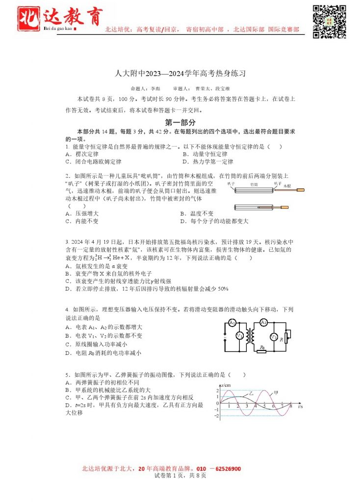 2024年北京各区高三三模陆续进行中,admw360教研组收集并整理了2024北京人大附中高三考前热身物理试卷含答案,分享给同学们。