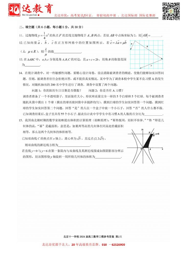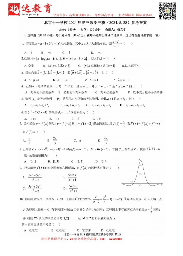 2024年北京各区高三三模陆续进行中,admw360教研组收集并整理了2024北京十一学校高三三模数学试卷含答案,分享给同学们。