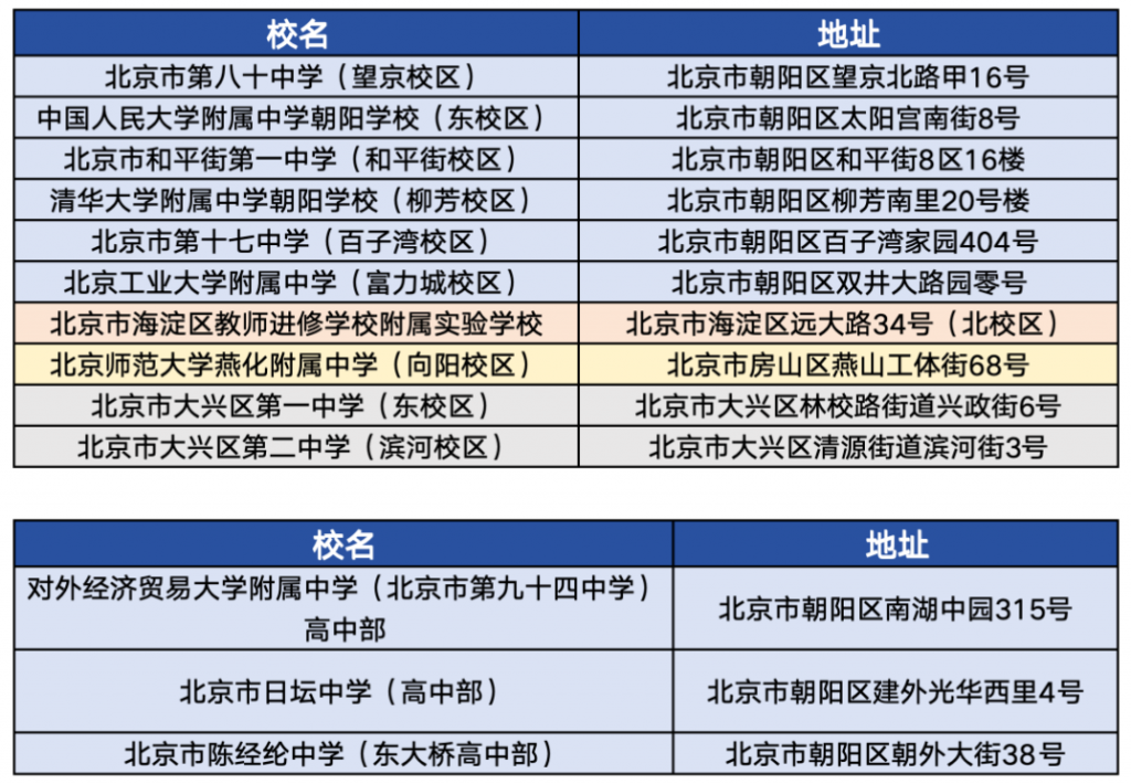 ■ 对外经济贸易大学附属中学(北京市第九十四中学)考点设在高中部,北京市日坛中学考点设在高中部,北京市陈经纶中学考点设在东大桥高中部。