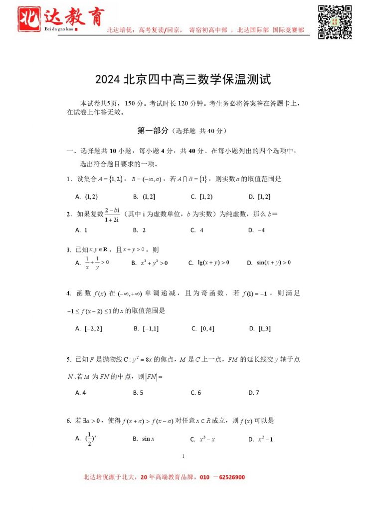 2024年北京各区高三三模陆续进行中,admw360教研组收集并整理了2024北京四中高三保温卷数学试卷含答案,分享给同学们。