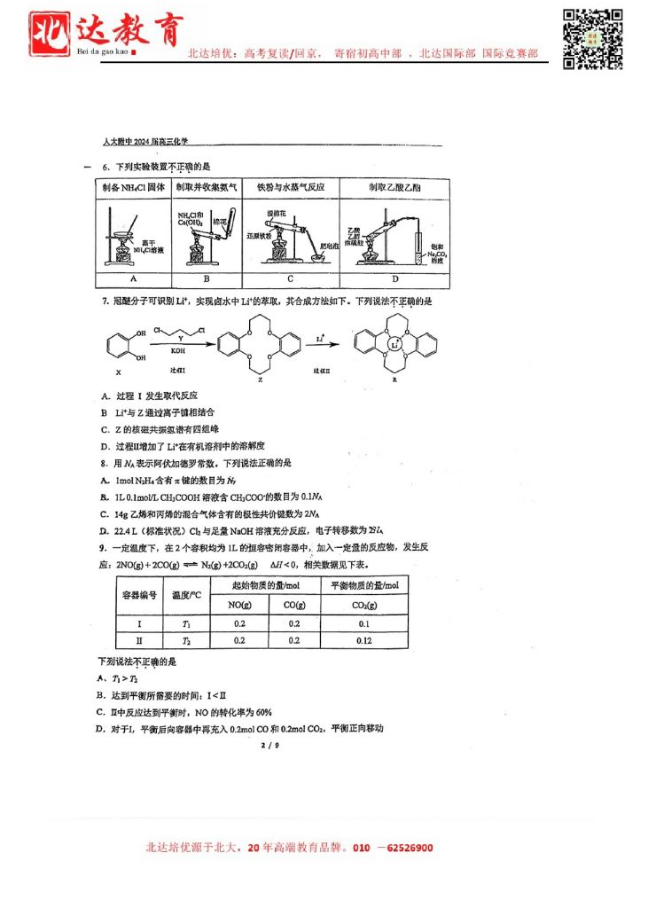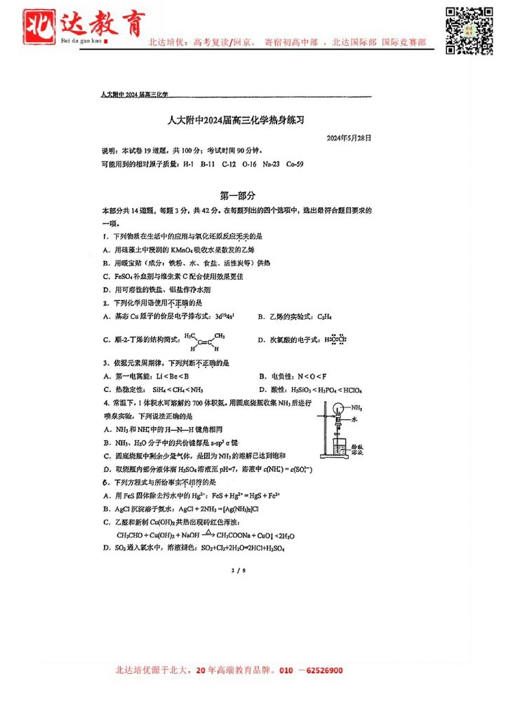 2024年北京各区高三三模陆续进行中,admw360教研组收集并整理了2024北京人大附中高三考前热身化学试卷含答案,分享给同学们。
